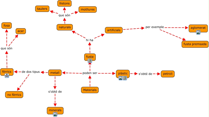 Este Cmap, tiene información relacionada con: Materials, fusta hi ha artificials, artificials per exemple aglomerat, metall de dos tipus no fèrrics, fusta hi ha naturals, Materials poden ser plàstic, fèrrics que són acer, naturals que són taulers, Materials poden ser fusta, Materials poden ser metall, artificials per exemple fusta premsada, metall s'obté de minerals, naturals que són motllures, naturals que són llistons, fèrrics que són fosa, metall de dos tipus fèrrics, plàstic s'obté de petroli