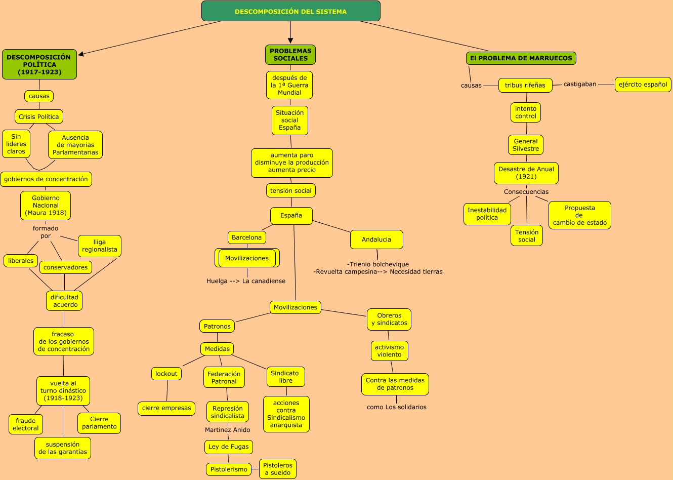 Este Cmap, tiene información relacionada con: punto 4 La descomposición del sistema ( 1917-1923), España ???? Barcelona, Medidas ???? Sindicato libre, vuelta al turno dinástico (1918-1923) ???? suspensión de las garantías, Desastre de Anual (1921) Consecuencias Inestabilidad política, Medidas ???? lockout, Contra las medidas de patronos como Los solidarios ????, tensión social ???? España, DESCOMPOSICIÓN DEL SISTEMA ???? PROBLEMAS SOCIALES, vuelta al turno dinástico (1918-1923) ???? Cierre parlamento, castigaban castigaban ejército español, España ???? Movilizaciones, liberales ???? lliga regionalista, causas ???? Crisis Política, Situación social España ???? aumenta paro disminuye la producción aumenta precio, PROBLEMAS SOCIALES ???? después de la 1ª Guerra Mundial, Crisis Política ???? Ausencia de mayorias Parlamentarias, Obreros y sindicatos ???? activismo violento, Gobierno Nacional (Maura 1918) formado por lliga regionalista, Crisis Política ???? Sin lideres claros, Sindicato libre ???? acciones contra Sindicalismo anarquista