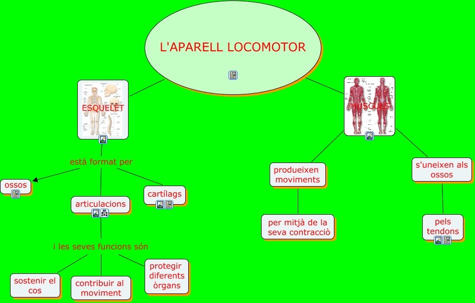 Aquest mapa conceptual conté informació relacionada amb: PRESENTACIO, MÚSCULS s'uneixen als ossos, ESQUELET està format per cartílags, articulacions i les seves funcions són protegir diferents òrgans, ESQUELET està format per articulacions, s'uneixen als ossos pels tendons, articulacions i les seves funcions són sostenir el cos, produeixen moviments per mitjà de la seva contracciò, L'APARELL LOCOMOTOR MÚSCULS, MÚSCULS produeixen moviments, ESQUELET està format per ossos, articulacions i les seves funcions són contribuir al moviment, L'APARELL LOCOMOTOR ESQUELET
