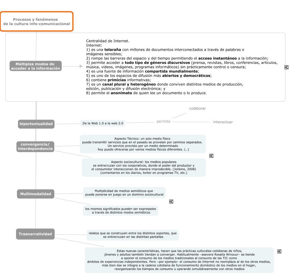 Este Cmap, tiene información relacionada con: Los procesos de convergencia, Procesos y fenómenos de la cultura info-comunicacional Trasnarratividad relatos que se construyen entre los distintos soportes, que se entrecruzan en las distintas pantallas, De la Web 1.0 a la web 2.0 permite interactuar, Procesos y fenómenos de la cultura info-comunicacional hipertextualidad De la Web 1.0 a la web 2.0, Procesos y fenómenos de la cultura info-comunicacional Multimodalidad Multiplicidad de medios semióticos que puede ponerse en juego en un dominio sociocultural, De la Web 1.0 a la web 2.0 permite colaborar, Procesos y fenómenos de la cultura info-comunicacional convergencia/ interdependencia Aspecto Técnico: un solo medio físico pueda transmitir servicios que en el pasado se proveían por caminos separados. Un servicio provisto por un medio determinado hoy puede ofrecerse por varios medios físicos diferentes. (..), Procesos y fenómenos de la cultura info-comunicacional Múltiples modos de acceder a la información Centralidad de Internet. Internet: 1) es una telaraña con millones de documentos interconectados a través de palabras o imágenes sensibles; 2) rompe las barreras del espacio y del tiempo permitiendo el acceso instantáneo a la información; 3) permite acceder a todo tipo de géneros discursivos (prensa, revistas, libros, conferencias, artículos, música, videos, imágenes, programas informáticos) sin prácticamente control o censura; 4) es una fuente de información compartida mundialmente; 5) es uno de los espacios de difusión más abiertos y democráticos; 6) contiene primicias informativas; 7) es un canal plural y heterogéneo donde conviven distintos medios de producción, edición, publicación y difusión electrónica; y 8) permite el anonimato de quien lee un documento o lo produce., Procesos y fenómenos de la cultura info-comunicacional Multimodalidad los mismos significados pueden ser expresados a través de distintos modos semióticos, Procesos y fenómenos de la cultura info-comunicacional Trasnarratividad Estas nuevas características, hacen que las prácticas culturales cotidianas de niños, jóvenes y adultos también tiendan a converger. Habitualmente –asevera Rosalía Winocur– se tiende a oponer el consumo de los medios tradicionales al consumo de las TIC como ámbitos de experiencias independientes. Pero –por ejemplo– el consumo de Internet no reemplaza al de los otros medios, más bien ése se integra a la cadena cotidiana de funcionamiento doméstico de los medios en el hogar, reorganizando los tiempos de consumo u operando simultáneamente con otros medios, Procesos y fenómenos de la cultura info-comunicacional convergencia/ interdependencia Aspecto sociocultural: los medios populares se entrecruzan con los corporativos, donde el poder del productor y el consumidor interaccionan de manera impredecible. (Jenkins, 2008) (comentarios en los diarios, twiter en programas TV, etc.)