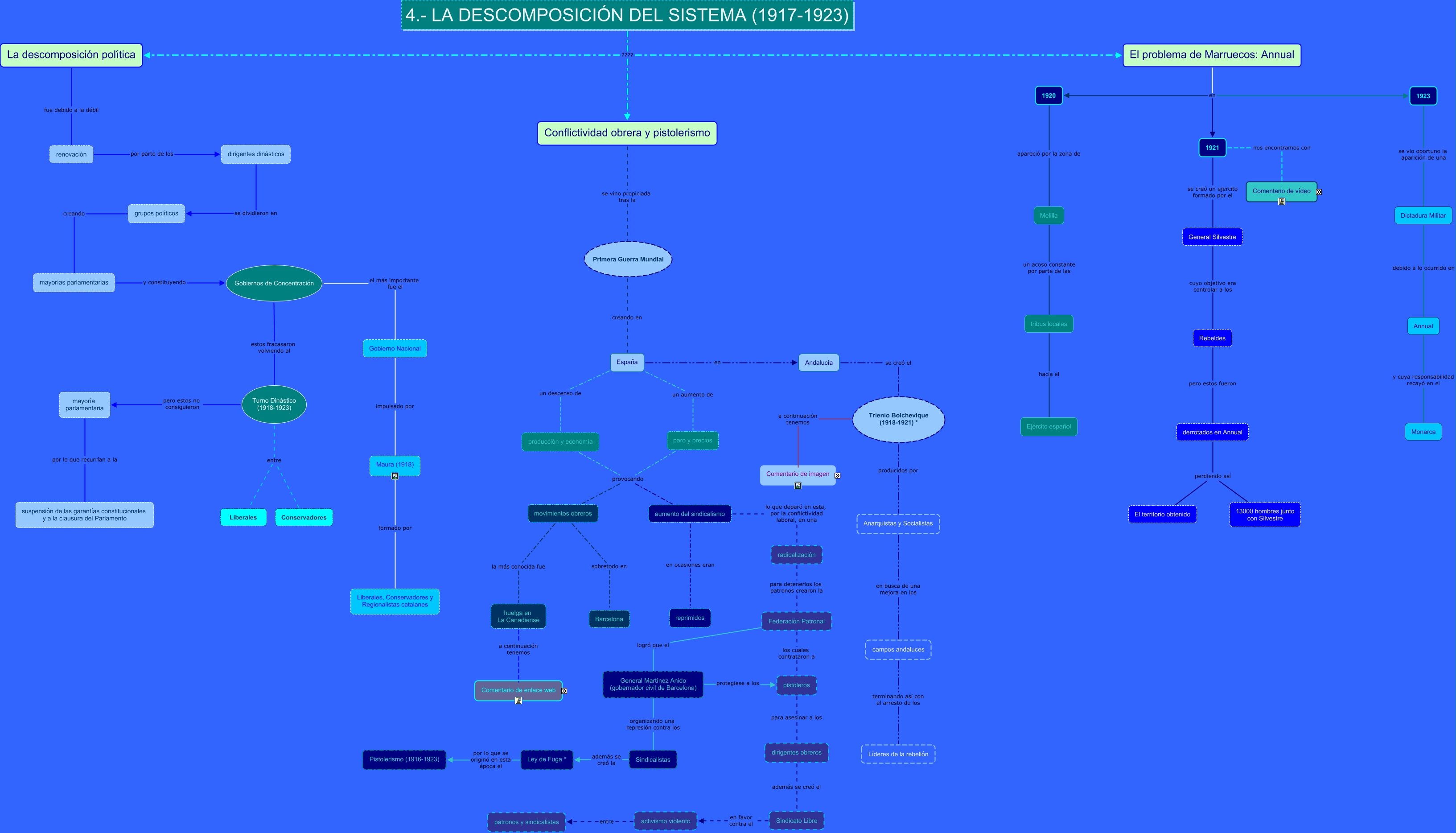 Este Cmap, tiene información relacionada con: Punto 4, España en Andalucía, General Silvestre cuyo objetivo era controlar a los Rebeldes, Comentario de imagen ¿Qué relación tiene con el tema? Viene relacionada por el nombre del que proviene el movimiento obrero andaluz, es decir de la revolución vivida en Rusia., dirigentes obreros además se creó el Sindicato Libre, Comentario de enlace web ¿Qué aspectos nos resultan más importantes? El gran movimiento que surgió debido a este hecho, ya que pasó de ser una simple huelga a una gran huelga, siendo un modelo a seguir., paro y precios provocando movimientos obreros, Federación Patronal logró que el General Martínez Anido (gobernador civil de Barcelona), Gobiernos de Concentración estos fracasaron volviendo al Turno Dinástico (1918-1923), Turno Dinástico (1918-1923) pero estos no consiguieron mayoría parlamentaria, tribus locales hacia el Ejército español, Annual y cuya responsabilidad recayó en el Monarca, 4.- LA DESCOMPOSICIÓN DEL SISTEMA (1917-1923) ???? Conflictividad obrera y pistolerismo, grupos políticos creando mayorías parlamentarias, Comentario de enlace web ¿Qué información aparece? Aparece la importancia de esto hecho ya que pasó a la historia debido a las repercusiones tanto en la industria como en la sociedad, ya que a partir de esta se produjo la huelga general y además dejó inactivo la industria barcelonesa., Sindicalistas además se creó la Ley de Fuga *, 4.- LA DESCOMPOSICIÓN DEL SISTEMA (1917-1923) ???? El problema de Marruecos: Annual, campos andaluces terminando así con el arresto de los Líderes de la rebelión, aumento del sindicalismo en ocasiones eran reprimidos, General Martínez Anido (gobernador civil de Barcelona) organizando una represión contra los Sindicalistas, El problema de Marruecos: Annual en 1921