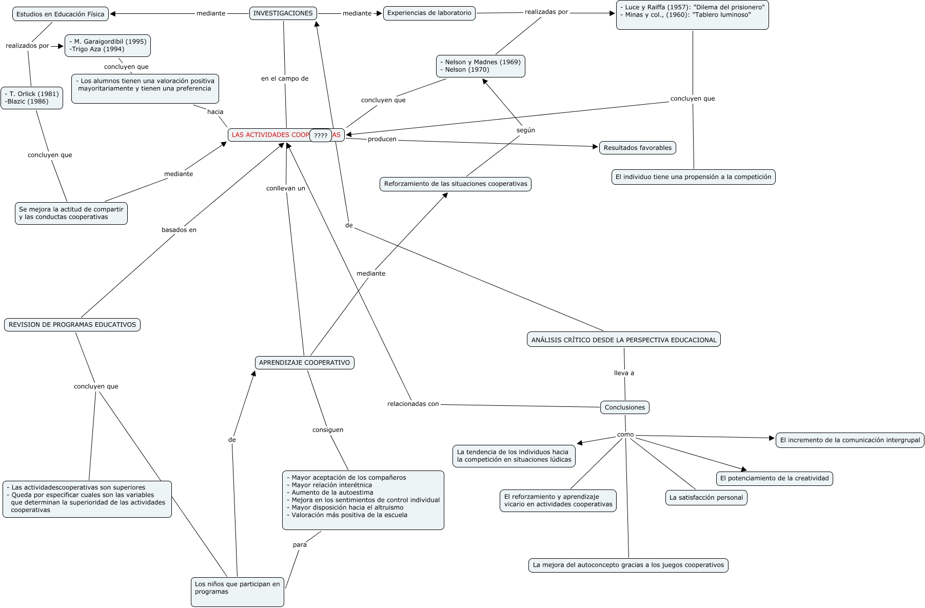Este Cmap, tiene información relacionada con: GONZALEZ_PEREZ_ALEXANDER_CMAP_G4, - Mayor aceptación de los compañeros - Mayor relación interétnica - Aumento de la autoestima - Mejora en los sentimientos de control individual - Mayor disposición hacia el altruismo - Valoración más positiva de la escuela para Los niños que participan en programas, REVISION DE PROGRAMAS EDUCATIVOS concluyen que Los niños que participan en programas, Estudios en Educación Física realizados por - M. Garaigordibil (1995) -Trigo Aza (1994), ANÁLISIS CRÍTICO DESDE LA PERSPECTIVA EDUCACIONAL de INVESTIGACIONES, Los niños que participan en programas de APRENDIZAJE COOPERATIVO, LAS ACTIVIDADES COOPERATIVAS conllevan un APRENDIZAJE COOPERATIVO, APRENDIZAJE COOPERATIVO mediante Reforzamiento de las situaciones cooperativas, REVISION DE PROGRAMAS EDUCATIVOS concluyen que - Las actividadescooperativas son superiores - Queda por especificar cuales son las variables que determinan la superioridad de las actividades cooperativas, INVESTIGACIONES mediante Experiencias de laboratorio, - T. Orlick (1981) -Blazic (1986) concluyen que Se mejora la actitud de compartir y las conductas cooperativas, Conclusiones como La satisfacción personal, Conclusiones como La tendencia de los individuos hacia la competición en situaciones lúdicas, - Luce y Raiffa (1957): "Dilema del prisionero" - Minas y col., (1960): "Tablero luminoso" concluyen que LAS ACTIVIDADES COOPERATIVAS, Experiencias de laboratorio realizadas por - Nelson y Madnes (1969) - Nelson (1970), - Nelson y Madnes (1969) - Nelson (1970) concluyen que LAS ACTIVIDADES COOPERATIVAS, Conclusiones como El potenciamiento de la creatividad, - Los alumnos tienen una valoración positiva mayoritariamente y tienen una preferencia hacia LAS ACTIVIDADES COOPERATIVAS, ANÁLISIS CRÍTICO DESDE LA PERSPECTIVA EDUCACIONAL lleva a Conclusiones, Conclusiones como El incremento de la comunicación intergrupal, - Luce y Raiffa (1957): "Dilema del prisionero" - Minas y col., (1960): "Tablero luminoso" concluyen que El individuo tiene una propensión a la competición