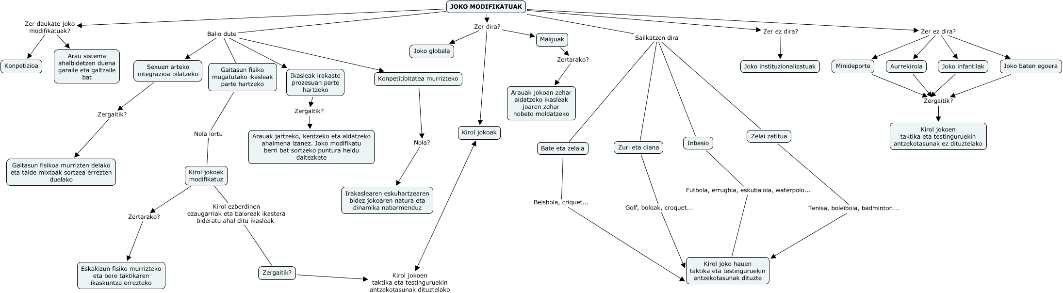 Este Cmap, tiene información relacionada con: Simon_Santamaria_Inigo_cmap_07, Ikasleak irakaste prozesuan parte hartzeko Zergaitik? Arauak jartzeko, kentzeko eta aldatzeko ahalmena izanez. Joko modifikatu berri bat sortzeko puntura heldu daitezkete, JOKO MODIFIKATUAK Zer dira? Malguak, Kirol jokoak modifikatuz Zertarako? Eskakizun fisiko murrizteko eta bere taktikaren ikaskuntza errezteko, JOKO MODIFIKATUAK Zer ez dira? Joko infantilak, JOKO MODIFIKATUAK Zer ez dira? Minideporte, Konpetitibitatea murrizteko Nola? Irakaslearen eskuhartzearen bidez jokoaren natura eta dinamika nabarmenduz, JOKO MODIFIKATUAK Zer ez dira? Aurrekirola, Minideporte Zergaitik? Kirol jokoen taktika eta testinguruekin antzekotasunak ez dituztelako, JOKO MODIFIKATUAK Zer dira? Joko globala, JOKO MODIFIKATUAK Zer ez dira? Joko instituzionalizatuak, Sexuen arteko integrazioa bilatzeko Zergaitik? Gaitasun fisikoa murrizten delako eta talde mixtoak sortzea errezten duelako, Zelai zatitua Tenisa, boleibola, badminton... Kirol joko hauen taktika eta testinguruekin antzekotasunak dituzte, JOKO MODIFIKATUAK Sailkatzen dira Zuri eta diana, Bate eta zelaia Beisbola, criquet... Kirol joko hauen taktika eta testinguruekin antzekotasunak dituzte, JOKO MODIFIKATUAK Balio dute Gaitasun fisiko mugatutako ikasleak parte hartzeko, JOKO MODIFIKATUAK Balio dute Konpetitibitatea murrizteko, Gaitasun fisiko mugatutako ikasleak parte hartzeko Nola lortu Kirol jokoak modifikatuz, Joko infantilak Zergaitik? Kirol jokoen taktika eta testinguruekin antzekotasunak ez dituztelako, JOKO MODIFIKATUAK Balio dute Ikasleak irakaste prozesuan parte hartzeko, JOKO MODIFIKATUAK Zer daukate joko modifikatuak? Arau sistema ahalbidetzen duena garaile eta galtzaile bat
