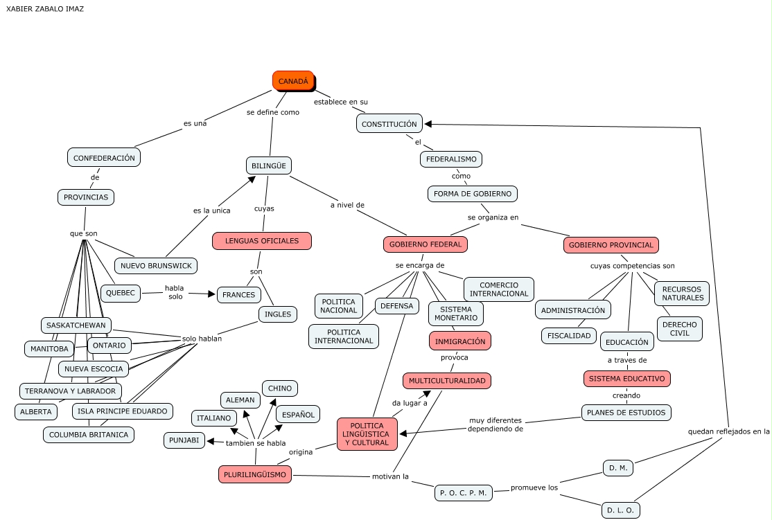 Este Cmap, tiene información relacionada con: ZABALO_IMAZ_XABIER_CMAP, GOBIERNO PROVINCIAL cuyas competencias son ADMINISTRACIÓN, PROVINCIAS que son QUEBEC, GOBIERNO PROVINCIAL cuyas competencias son RECURSOS NATURALES, CANADÁ establece en su CONSTITUCIÓN, PROVINCIAS que son ISLA PRINCIPE EDUARDO, EDUCACIÓN a traves de SISTEMA EDUCATIVO, SASKATCHEWAN solo hablan INGLES, PLURILINGÜISMO tambien se habla CHINO, FEDERALISMO como FORMA DE GOBIERNO, PROVINCIAS que son COLUMBIA BRITANICA, CONFEDERACIÓN de PROVINCIAS, ISLA PRINCIPE EDUARDO solo hablan INGLES, POLITICA LINGÜISTICA Y CULTURAL origina PLURILINGÜISMO, GOBIERNO PROVINCIAL cuyas competencias son DERECHO CIVIL, ONTARIO solo hablan INGLES, MANITOBA solo hablan INGLES, NUEVO BRUNSWICK es la unica BILINGÜE, GOBIERNO PROVINCIAL cuyas competencias son EDUCACIÓN, GOBIERNO FEDERAL se encarga de POLITICA LINGÜISTICA Y CULTURAL, PROVINCIAS que son MANITOBA