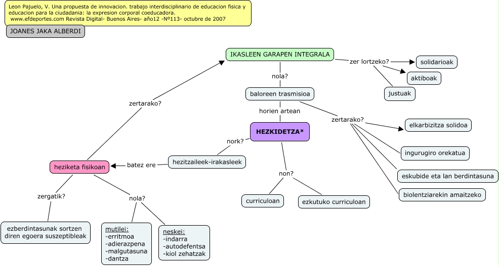 Este Cmap, tiene información relacionada con: JOANES_JAKA_ALBERDI_cmap_T8, IKASLEEN GARAPEN INTEGRALA zer lortzeko? justuak, IKASLEEN GARAPEN INTEGRALA zer lortzeko? solidarioak, heziketa fisikoan zertarako? IKASLEEN GARAPEN INTEGRALA, HEZKIDETZA* non? curriculoan, heziketa fisikoan zergatik? ezberdintasunak sortzen diren egoera suszeptibleak, HEZKIDETZA* non? ezkutuko curriculoan, heziketa fisikoan nola? mutilei: -erritmoa -adierazpena -malgutasuna -dantza, IKASLEEN GARAPEN INTEGRALA zer lortzeko? aktiboak, baloreen trasmisioa zertarako? ingurugiro orekatua, baloreen trasmisioa zertarako? biolentziarekin amaitzeko, HEZKIDETZA* nork? hezitzaileek-irakasleek, baloreen trasmisioa horien artean HEZKIDETZA*, IKASLEEN GARAPEN INTEGRALA nola? baloreen trasmisioa, baloreen trasmisioa zertarako? eskubide eta lan berdintasuna, heziketa fisikoan nola? neskei: -indarra -autodefentsa -kiol zehatzak, hezitzaileek-irakasleek batez ere heziketa fisikoan, baloreen trasmisioa zertarako? elkarbizitza solidoa