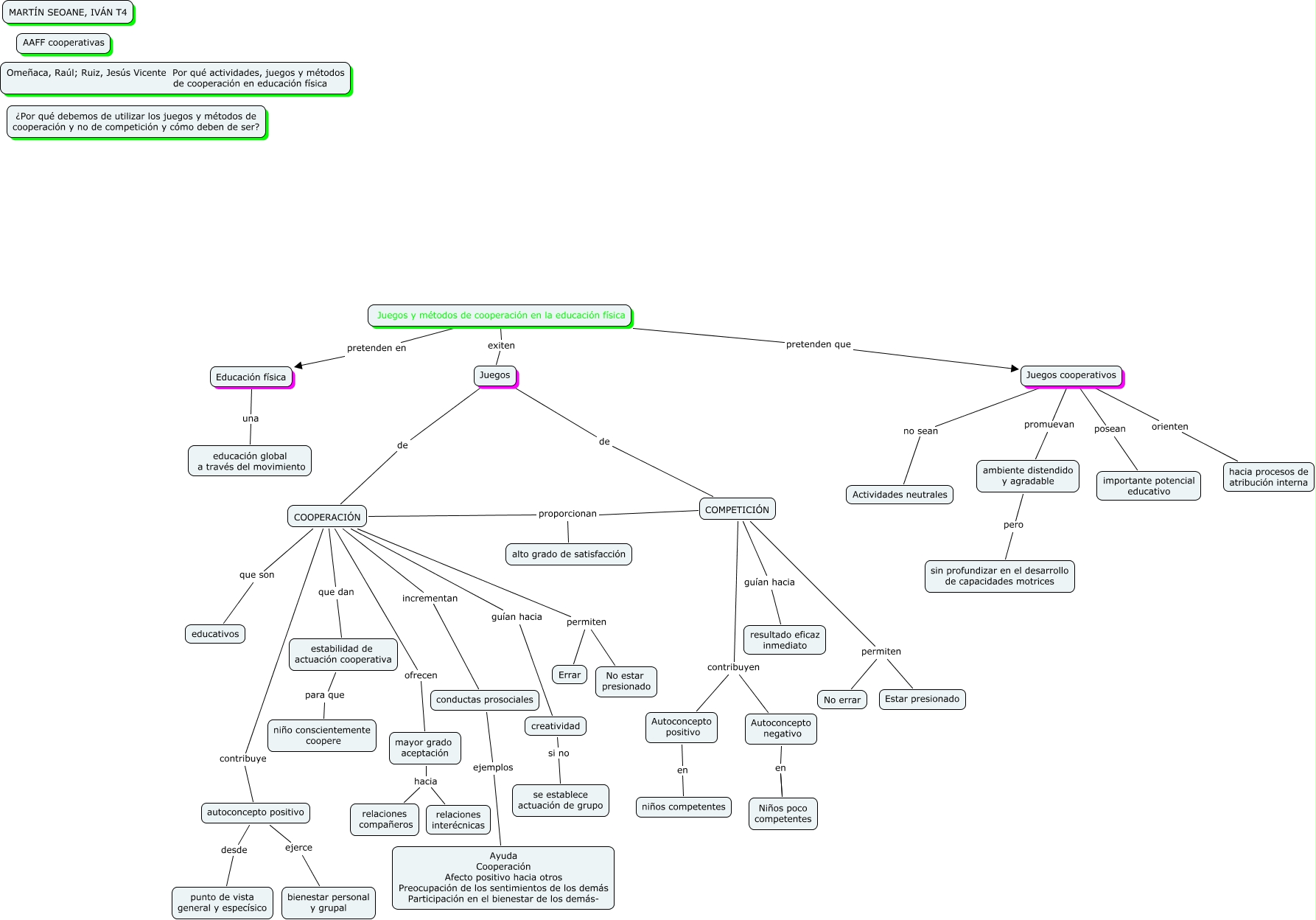 Este Cmap, tiene información relacionada con: Martin_Seoane_Ivan_cmap_4, creatividad si no se establece actuación de grupo, COOPERACIÓN permiten Errar, COOPERACIÓN que son educativos, COOPERACIÓN proporcionan alto grado de satisfacción, COOPERACIÓN que dan estabilidad de actuación cooperativa, mayor grado aceptación hacia relaciones interécnicas, Autoconcepto negativo en Niños poco competentes, COMPETICIÓN proporcionan alto grado de satisfacción, autoconcepto positivo ejerce bienestar personal y grupal, COMPETICIÓN contribuyen Autoconcepto negativo, Juegos y métodos de cooperación en la educación física pretenden que Juegos cooperativos, COOPERACIÓN permiten No estar presionado, Juegos cooperativos orienten hacia procesos de atribución interna, Educación física una educación global a través del movimiento, Juegos de COMPETICIÓN, COOPERACIÓN contribuye autoconcepto positivo, COOPERACIÓN ofrecen mayor grado aceptación, COMPETICIÓN permiten Estar presionado, estabilidad de actuación cooperativa para que niño conscientemente coopere, Juegos de COOPERACIÓN