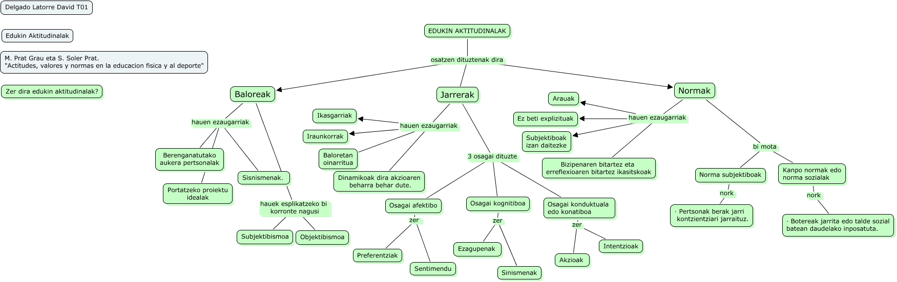 Este Cmap, tiene información relacionada con: Delgado_Latorre_David_Cmap_T01, EDUKIN AKTITUDINALAK osatzen dituztenak dira Normak, Jarrerak hauen ezaugarriak Dinamikoak dira akzioaren beharra behar dute., Normak hauen ezaugarriak Ez beti explizituak, Baloreak hauek esplikatzeko bi korronte nagusi Subjektibismoa, Osagai kognitiboa zer Ezagupenak, Normak hauen ezaugarriak Subjektiboak izan daitezke, Osagai afektibo zer Sentimendu, Osagai afektibo zer Preferentziak, Jarrerak 3 osagai dituzte Osagai kognitiboa, Baloreak hauen ezaugarriak Sisnismenak., EDUKIN AKTITUDINALAK osatzen dituztenak dira Baloreak, Osagai konduktuala edo konatiboa zer Intentzioak, Normak bi mota Norma subjektiboak, Jarrerak hauen ezaugarriak Iraunkorrak, Normak bi mota Kanpo normak edo norma sozialak, Osagai kognitiboa zer Sinismenak, EDUKIN AKTITUDINALAK osatzen dituztenak dira Jarrerak, Jarrerak 3 osagai dituzte Osagai afektibo, Jarrerak hauen ezaugarriak Baloretan oinarritua, Baloreak hauen ezaugarriak Berenganatutako aukera pertsonalak