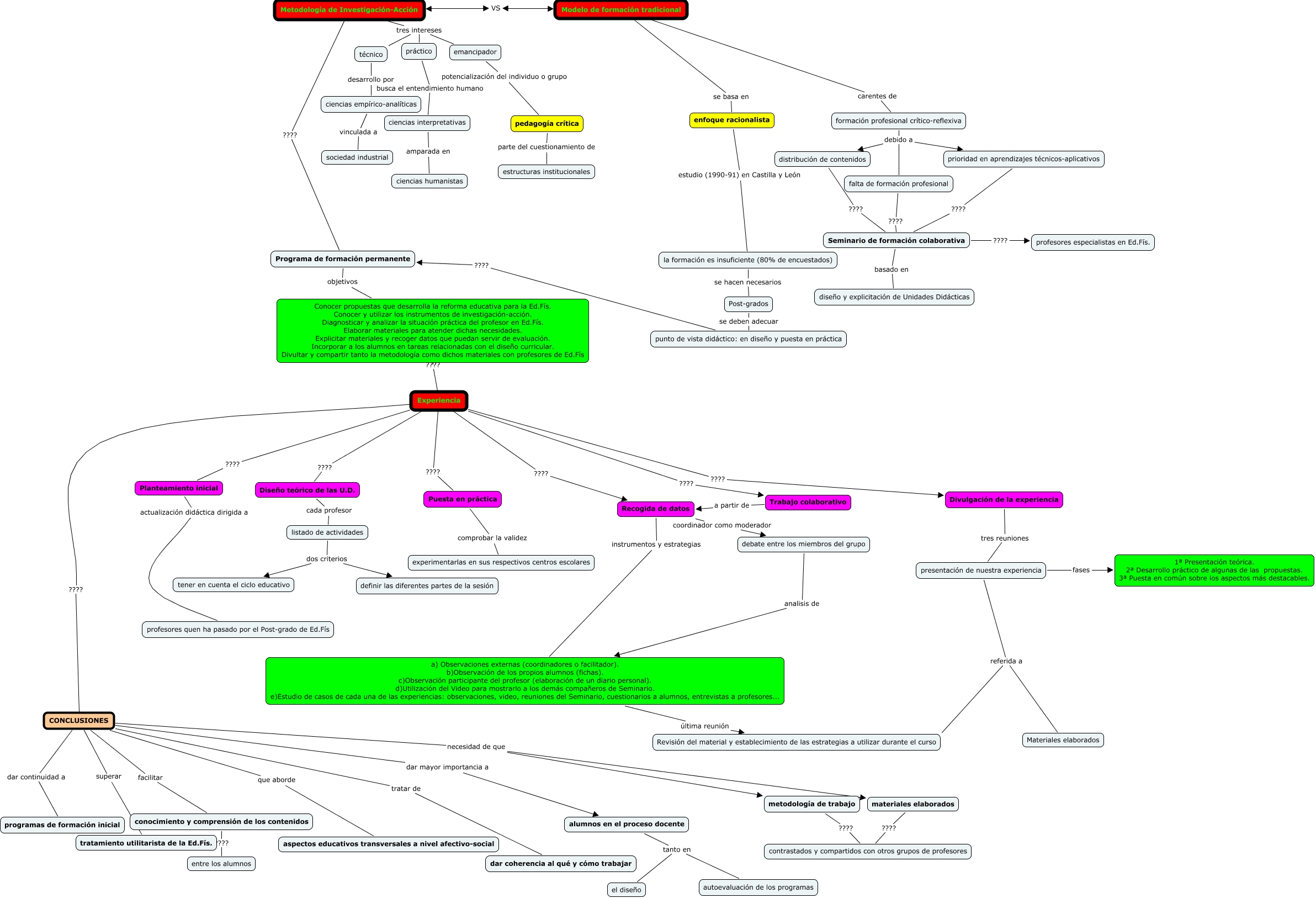 Este Cmap, tiene información relacionada con: Vicente_Sarasua_Gonzalo_cmap_G2, Experiencia ???? Planteamiento inicial, punto de vista didáctico: en diseño y puesta en práctica ???? Programa de formación permanente, Metodología de Investigación-Acción tres intereses práctico, Metodología de Investigación-Acción ???? Programa de formación permanente, Diseño teórico de las U.D. cada profesor listado de actividades, distribución de contenidos ???? Seminario de formación colaborativa, CONCLUSIONES dar mayor importancia a alumnos en el proceso docente, la formación es insuficiente (80% de encuestados) se hacen necesarios Post-grados, prioridad en aprendizajes técnicos-aplicativos ???? Seminario de formación colaborativa, Modelo de formación tradicional se basa en enfoque racionalista, formación profesional crítico-reflexiva debido a prioridad en aprendizajes técnicos-aplicativos, listado de actividades dos criterios tener en cuenta el ciclo educativo, Metodología de Investigación-Acción tres intereses emancipador, Post-grados se deben adecuar punto de vista didáctico: en diseño y puesta en práctica, metodología de trabajo ???? contrastados y compartidos con otros grupos de profesores, ciencias empírico-analíticas vinculada a sociedad industrial, materiales elaborados ???? contrastados y compartidos con otros grupos de profesores, Experiencia ???? CONCLUSIONES, enfoque racionalista estudio (1990-91) en Castilla y León la formación es insuficiente (80% de encuestados), Experiencia ???? Puesta en práctica