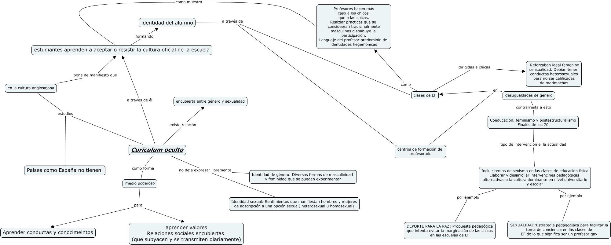 Este Cmap, tiene información relacionada con: Curriculum_oculto_completo, clases de EF como Profesores hacen más caso a los chicos que a las chicas. Realziar practicas que se consideeran tradicinalmente masculinas disminuye la participación. Lenguaje del profesor predominio de identidades hegemónicas, identidad del alumno a través de clases de EF, Curiculum oculto existe relación encubierta entre género y sexualidad, estudiantes aprenden a aceptar o resistir la cultura oficial de la escuela formando identidad del alumno, desugualdades de genero contrarresta a esto Coeducación, feminismo y postestructuralismo Finales de los 70, Incluir temas de sexismo en las clases de educacion fisica Elaborar y desarrollar intervencines pedagógicas alternativas a la cultura dominante en nivel universitario y escolar por ejemplo DEPORTE PARA LA PAZ: Propuesta pedagógica que intenta evitar la marginación de las chicas en las escuelas de EF, identidad del alumno a través de centros de formación de profesorado, Coeducación, feminismo y postestructuralismo Finales de los 70 tipo de intervención el la actualidad Incluir temas de sexismo en las clases de educacion fisica Elaborar y desarrollar intervencines pedagógicas alternativas a la cultura dominante en nivel universitario y escolar, estudiantes aprenden a aceptar o resistir la cultura oficial de la escuela como muestra Profesores hacen más caso a los chicos que a las chicas. Realziar practicas que se consideeran tradicinalmente masculinas disminuye la participación. Lenguaje del profesor predominio de identidades hegemónicas, Incluir temas de sexismo en las clases de educacion fisica Elaborar y desarrollar intervencines pedagógicas alternativas a la cultura dominante en nivel universitario y escolar por ejemplo SEXUALIDAD:Estrategia pedagogiaca para facilitar la toma de conciencia en las clases de EF de lo que significa ser un profesor gay, Curiculum oculto no deja expresar libremente Identidad de género: Diversas formas de masculinidad y feminidad que se pueden experimentar, clases de EF dirigidas a chicas Reforzaban ideal femenino sensualidad. Debían tener conductas heterosexuales para no ser calificadas de marimachos, medio poderoso para aprender valores Relaciones sociales encubiertas (que subyacen y se transmiten diariamente), desugualdades de genero en clases de EF, medio poderoso para Aprender conductas y conocimeintos, en la cultura anglosajona pone de manifiesto que estudiantes aprenden a aceptar o resistir la cultura oficial de la escuela, desugualdades de genero en centros de formación de profesorado, en la cultura anglosajona estudios Paises como España no tienen, Curiculum oculto no deja expresar libremente Identidad sexual: Sentimientos que manifiestan hombres y mujeres de adscripción a una opción sexual( heterosexual u homosexual), Curiculum oculto a traves de él estudiantes aprenden a aceptar o resistir la cultura oficial de la escuela