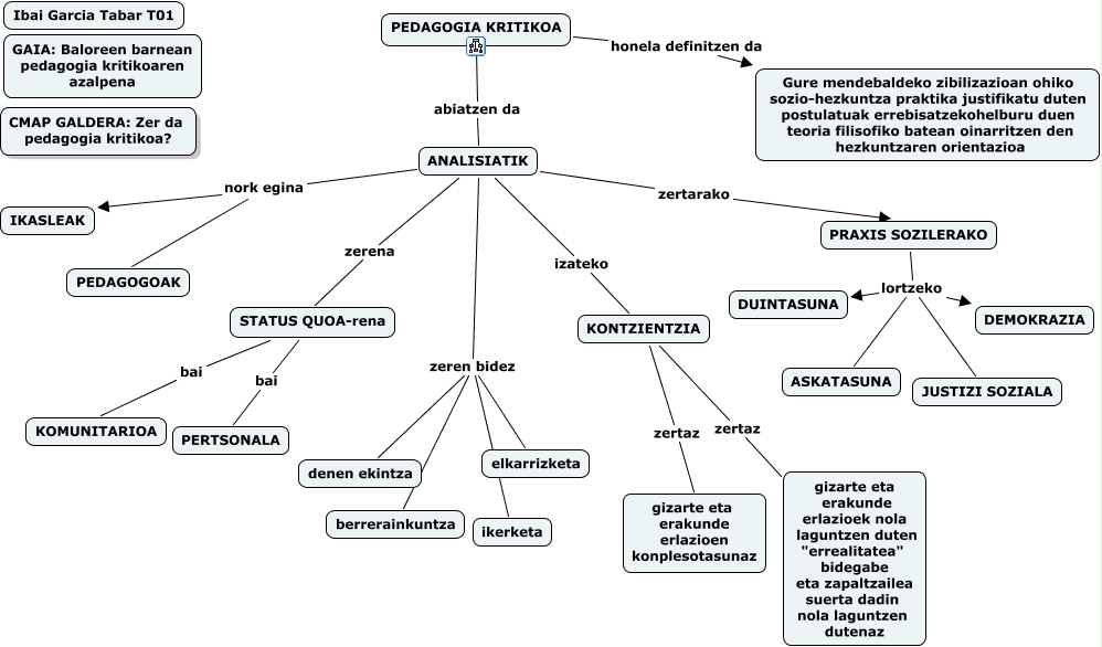 Este Cmap, tiene información relacionada con: Garcia_Tabar_Ibai_cmap_hobetuaren_errekursoa_T01, PEDAGOGIA KRITIKOA abiatzen da ANALISIATIK, ANALISIATIK nork egina PEDAGOGOAK, STATUS QUOA-rena bai KOMUNITARIOA, ANALISIATIK zerena STATUS QUOA-rena, ANALISIATIK nork egina IKASLEAK, PRAXIS SOZILERAKO lortzeko DEMOKRAZIA, PRAXIS SOZILERAKO lortzeko DUINTASUNA, ANALISIATIK zeren bidez ikerketa, PEDAGOGIA KRITIKOA honela definitzen da Gure mendebaldeko zibilizazioan ohiko sozio-hezkuntza praktika justifikatu duten postulatuak errebisatzekohelburu duen teoria filisofiko batean oinarritzen den hezkuntzaren orientazioa, KONTZIENTZIA zertaz gizarte eta erakunde erlazioek nola laguntzen duten "errealitatea" bidegabe eta zapaltzailea suerta dadin nola laguntzen dutenaz, ANALISIATIK zeren bidez berrerainkuntza, KONTZIENTZIA zertaz gizarte eta erakunde erlazioen konplesotasunaz, PRAXIS SOZILERAKO lortzeko JUSTIZI SOZIALA, ANALISIATIK zertarako PRAXIS SOZILERAKO, ANALISIATIK zeren bidez denen ekintza, STATUS QUOA-rena bai PERTSONALA, ANALISIATIK zeren bidez elkarrizketa, ANALISIATIK izateko KONTZIENTZIA, PRAXIS SOZILERAKO lortzeko ASKATASUNA