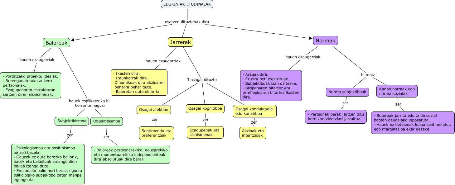 Este Cmap, tiene información relacionada con: Edukin aktitudinalak 1, Kanpo normak edo norma sozialak zer · Botereak jarrita edo talde sozial batean daudelako inposatuta. · Hauek ez betetzeak kulpa sentimendua edo marginazioa ekar dezake., Objektibismoa zer · Baloreak pertsonarekiko, gauzarekiko eta momentuarekiko independienteak dira;absolutuak dira beraz., EDUKIN AKTITUDINALAK osatzen dituztenak dira Normak, Baloreak hauen ezaugarriak · Portatzeko proiektu idealak. · Berenganatutako aukera pertsonalak. · Ezagupenaren estrukturan sartzen diren sisnismenak., EDUKIN AKTITUDINALAK osatzen dituztenak dira Jarrerak, Osagai konduktuala edo konatiboa zer Akzioak eta intentzioak, Jarrerak hauen ezaugarriak · Ikasten dira. · Iraunkorrak dira. ·Dinamikoak dira akzioaren beharra behar dute. · Baloretan dute oinarria., Norma subjektiboak zer · Pertsonak berak jartzen ditu bere kontzientziari jarraituz., Normak bi mota Norma subjektiboak, Normak bi mota Kanpo normak edo norma sozialak, Baloreak hauek esplikatzeko bi korronte nagusi Subjektibismoa, Baloreak hauek esplikatzeko bi korronte nagusi Objektibismoa, Osagai kognitiboa zer Ezagupenak eta sisnismenak, Jarrerak 3 osagai dituzte Osagai konduktuala edo konatiboa, Osagai afektibo zer Sentimendu eta preferentziak, Subjektibismoa zer · Psikologismoa eta positibismoa oinarri bezala. · Gauzek ez dute berezko baliorik, baizik eta bakoitzak emango dien balioa izango dute. · Emandako balio hori beraz, egoera psikologiko subjektibo baten menpe egongo da., EDUKIN AKTITUDINALAK osatzen dituztenak dira Baloreak, Jarrerak 3 osagai dituzte Osagai afektibo, Normak hauen ezaugarriak · Arauak dira. · Ez dira beti explizituak. · Subjektiboak izan daitezke. · Bizipenaren bitartez eta erreflexioaren bitartez ikasten dira., Jarrerak 3 osagai dituzte Osagai kognitiboa