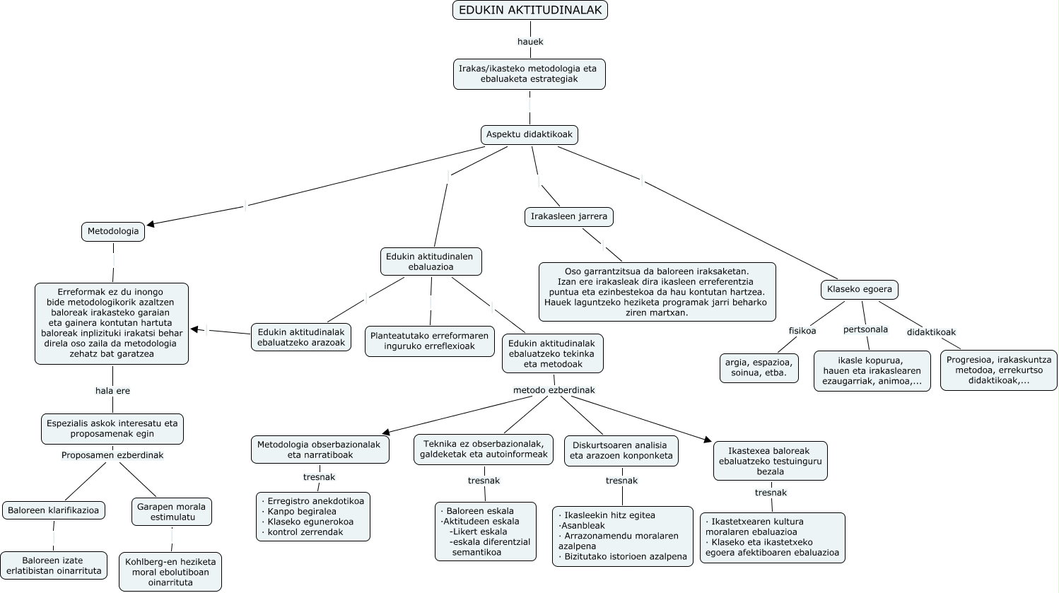 Este Cmap, tiene información relacionada con: Irakas ikasteko metodologia eta ebaluaketa estrategiak, Erreformak ez du inongo bide metodologikorik azaltzen baloreak irakasteko garaian eta gainera kontutan hartuta baloreak inplizituki irakatsi behar direla oso zaila da metodologia zehatz bat garatzea hala ere Espezialis askok interesatu eta proposamenak egin, Edukin aktitudinalak ebaluatzeko tekinka eta metodoak metodo ezberdinak Teknika ez obserbazionalak, galdeketak eta autoinformeak, Teknika ez obserbazionalak, galdeketak eta autoinformeak tresnak · Baloreen eskala ·Aktitudeen eskala -Likert eskala -eskala diferentzial semantikoa, Klaseko egoera fisikoa argia, espazioa, soinua, etba., Edukin aktitudinalak ebaluatzeko arazoak Erreformak ez du inongo bide metodologikorik azaltzen baloreak irakasteko garaian eta gainera kontutan hartuta baloreak inplizituki irakatsi behar direla oso zaila da metodologia zehatz bat garatzea, Metodologia Erreformak ez du inongo bide metodologikorik azaltzen baloreak irakasteko garaian eta gainera kontutan hartuta baloreak inplizituki irakatsi behar direla oso zaila da metodologia zehatz bat garatzea, Edukin aktitudinalen ebaluazioa Edukin aktitudinalak ebaluatzeko arazoak, Aspektu didaktikoak Klaseko egoera, Klaseko egoera didaktikoak Progresioa, irakaskuntza metodoa, errekurtso didaktikoak,..., Baloreen klarifikazioa Baloreen izate erlatibistan oinarrituta, Ikastexea baloreak ebaluatzeko testuinguru bezala tresnak · Ikastetxearen kultura moralaren ebaluazioa · Klaseko eta ikastetxeko egoera afektiboaren ebaluazioa, Diskurtsoaren analisia eta arazoen konponketa tresnak · Ikasleekin hitz egitea ·Asanbleak · Arrazonamendu moralaren azalpena · Bizitutako istorioen azalpena, Edukin aktitudinalak ebaluatzeko tekinka eta metodoak metodo ezberdinak Diskurtsoaren analisia eta arazoen konponketa, Edukin aktitudinalak ebaluatzeko tekinka eta metodoak metodo ezberdinak Ikastexea baloreak ebaluatzeko testuinguru bezala, Edukin aktitudinalak ebaluatzeko tekinka eta metodoak metodo ezberdinak Metodologia obserbazionalak eta narratiboak, EDUKIN AKTITUDINALAK hauek Irakas/ikasteko metodologia eta ebaluaketa estrategiak, Aspektu didaktikoak Irakasleen jarrera, Irakas/ikasteko metodologia eta ebaluaketa estrategiak Aspektu didaktikoak, Aspektu didaktikoak Metodologia, Irakasleen jarrera Oso garrantzitsua da baloreen iraksaketan. Izan ere irakasleak dira ikasleen erreferentzia puntua eta ezinbestekoa da hau kontutan hartzea. Hauek laguntzeko heziketa programak jarri beharko ziren martxan.