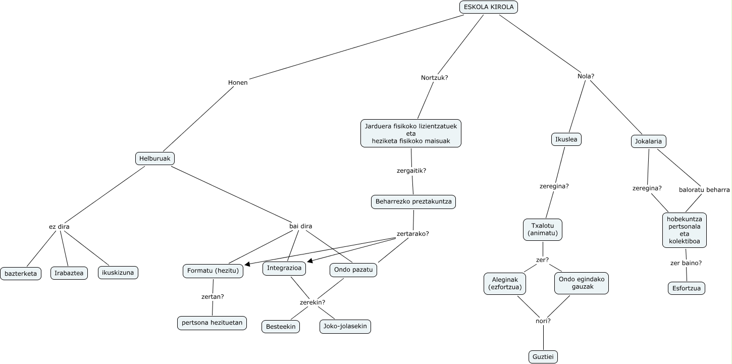 Este Cmap, tiene información relacionada con: escolastico_gorritxo_yeray_cmap_t11, Helburuak ez dira ikuskizuna, Beharrezko preztakuntza zertarako? Formatu (hezitu), Beharrezko preztakuntza zertarako? Integrazioa, Helburuak bai dira Integrazioa, Aleginak (ezfortzua) nori? Guztiei, ESKOLA KIROLA Honen Helburuak, Ondo pazatu zerekin? Besteekin, hobekuntza pertsonala eta kolektiboa zer baino? Esfortzua, ESKOLA KIROLA Nola? Ikuslea, ESKOLA KIROLA Nola? Jokalaria, Ikuslea zeregina? Txalotu (animatu), Helburuak bai dira Ondo pazatu, ESKOLA KIROLA Nortzuk? Jarduera fisikoko lizientzatuek eta heziketa fisikoko maisuak, Integrazioa zerekin? Joko-jolasekin, Integrazioa zerekin? Besteekin, Ondo pazatu zerekin? Joko-jolasekin, Jarduera fisikoko lizientzatuek eta heziketa fisikoko maisuak zergaitik? Beharrezko preztakuntza, Formatu (hezitu) zertan? pertsona hezituetan, Ondo egindako gauzak nori? Guztiei, Helburuak ez dira bazterketa