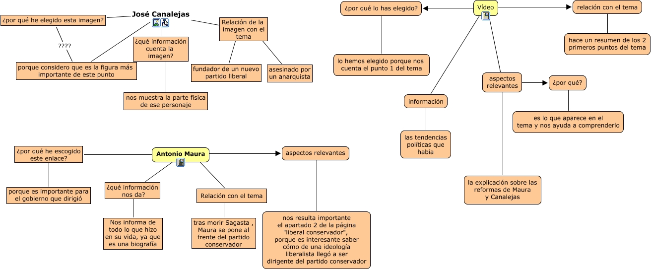 Este Cmap, tiene información relacionada con: fotos, enlaces y videos punto 1, Antonio Maura kj aspectos relevantes, aspectos relevantes ???? ¿por qué?, relación con el tema ???? hace un resumen de los 2 primeros puntos del tema, ¿por qué he escogido este enlace? ???? Antonio Maura, aspectos relevantes ???? nos resulta importante el apartado 2 de la página "liberal conservador", porque es interesante saber cómo de una ideología liberalista llegó a ser dirigente del partido conservador, información ???? las tendencias políticas que había, ¿qué información cuenta la imagen? ???? nos muestra la parte física de ese personaje, Relación con el tema ???? tras morir Sagasta , Maura se pone al frente del partido conservador, Relación con el tema ???? Antonio Maura, ¿por qué he escogido este enlace? ???? porque es importante para el gobierno que dirigió, Relación de la imagen con el tema ???? fundador de un nuevo partido liberal, ¿por qué he elegido esta imagen? José Canalejas porque considero que es la figura más importante de este punto, ¿qué información nos da? ???? Nos informa de todo lo que hizo en su vida, ya que es una biografía, Vídeo ???? ¿por qué lo has elegido?, Vídeo ???? aspectos relevantes, Vídeo ???? relación con el tema, ¿por qué he elegido esta imagen? ???? porque considero que es la figura más importante de este punto, ¿qué información nos da? ???? Antonio Maura, ¿qué información cuenta la imagen? José Canalejas porque considero que es la figura más importante de este punto, ¿por qué lo has elegido? ???? lo hemos elegido porque nos cuenta el punto 1 del tema