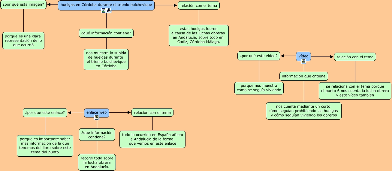 Este Cmap, tiene información relacionada con: fotos, enlaces y vídeos punto 6, relación con el tema ???? se relaciona con el tema porque el punto 6 nos cuenta la lucha obrera y este vídeo también, Vídeo ???? relación con el tema, ¿por qué esta imagen? ???? porque es una clara representación de lo que ocurrió, relación con el tema ???? estas huelgas fueron a causa de las luchas obreras en Andalucía, sobre todo en Cádiz, Córdoba Málaga., ¿por qué este enlace? ???? porque es importante saber más información de la que tenemos del libro sobre este tema del punto, Vídeo ???? ¿por qué este vídeo?, información que cntiene ???? nos cuenta mediante un corto cómo seguían prohibiendo las huelgas y cómo seguían viviendo los obreros, Vídeo ???? información que cntiene, relación con el tema ???? todo lo ocurrido en España afectó a Andalucía de la forma que vemos en este enlace, ¿por qué este vídeo? ???? porque nos muestra cómo se seguía viviendo, ¿qué información contiene? ???? recoge todo sobre la lucha obrera en Andalucía., enlace web ???? ¿qué información contiene?, enlace web ???? relación con el tema, ¿qué información contiene? ???? nos muestra la subida de huelgas durante el trienio bolchevique en Córdoba, huelgas en Córdoba durante el trienio bolchevique ???? relación con el tema, huelgas en Córdoba durante el trienio bolchevique ???? ¿por qué esta imagen?, enlace web ???? ¿por qué este enlace?, huelgas en Córdoba durante el trienio bolchevique ???? ¿qué información contiene?