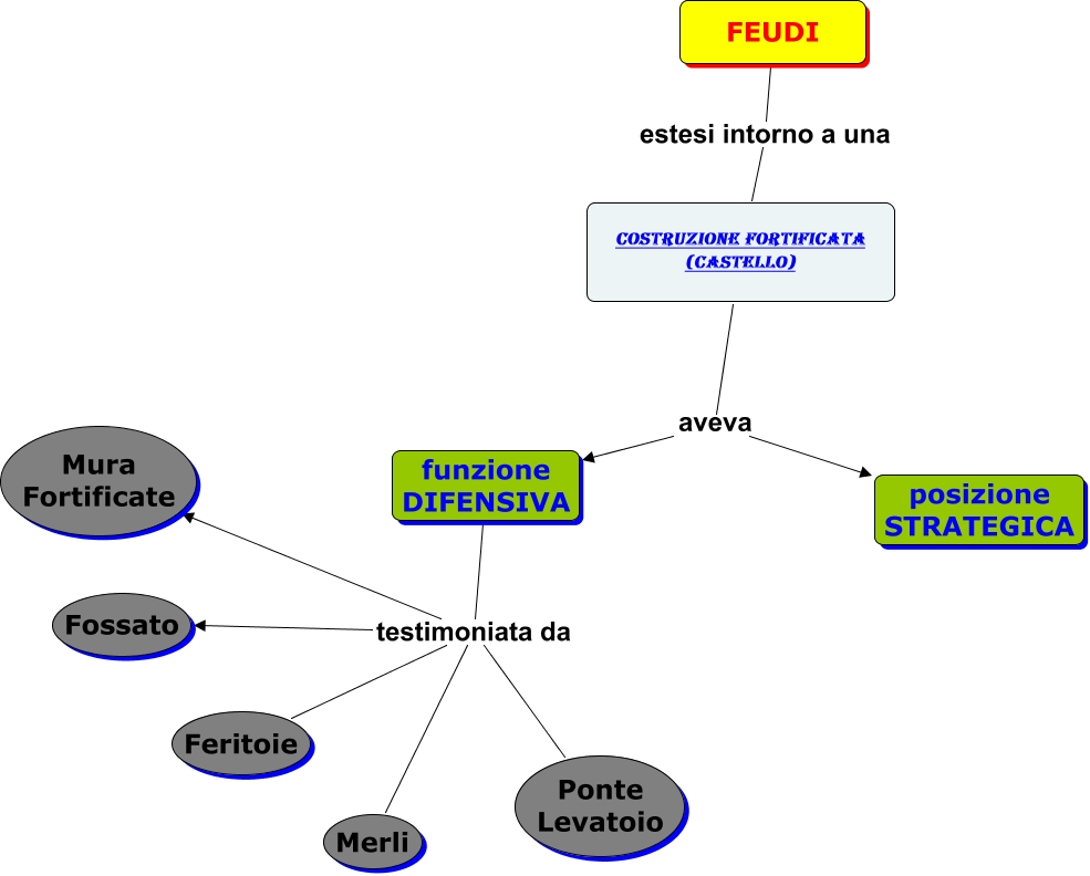 Questa Cmap, creata con IHMC CmapTools, contiene informazioni relative a: Feudi, funzione DIFENSIVA testimoniata da Merli, FEUDI estesi intorno a una Costruzione Fortificata (castello), Costruzione Fortificata (castello) aveva funzione DIFENSIVA, funzione DIFENSIVA testimoniata da Mura Fortificate, funzione DIFENSIVA testimoniata da Ponte Levatoio, funzione DIFENSIVA testimoniata da Fossato, Costruzione Fortificata (castello) aveva posizione STRATEGICA, funzione DIFENSIVA testimoniata da Feritoie