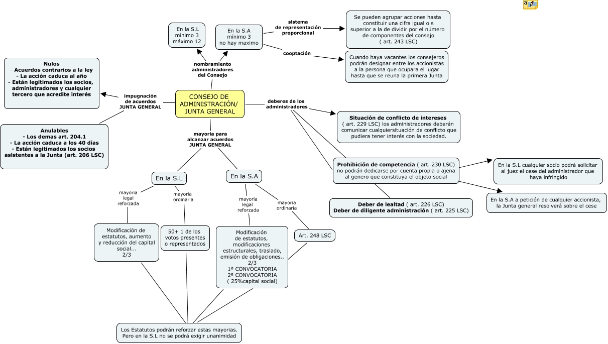 Este Cmap, tiene información relacionada con: Escenario 6, En la S.A mayoria ordinaria Art. 248 LSC, En la S.L mayoria legal reforzada Modificación de estatutos, aumento y reducción del capital social... 2/3, CONSEJO DE ADMINISTRACIÓN/ JUNTA GENERAL nombramiento administradores del Consejo En la S.L mínimo 3 máximo 12, 50+ 1 de los votos presentes o representados ???? Los Estatutos podrán reforzar estas mayorias. Pero en la S.L no se podrá exigir unanimidad, Prohibición de competencia ( art. 230 LSC) no podrán dedicarse por cuenta propia o ajena al genero que constituya el objeto social ???? En la S.A a petición de cualquier accionista, la Junta general resolverá sobre el cese, En la S.A mínimo 3 no hay maximo sistema de representación proporcional Se pueden agrupar acciones hasta constituir una cifra igual o s superior a la de dividir por el número de componentes del consejo ( art. 243 LSC), En la S.A mayoria legal reforzada Modificación de estatutos, modificaciones estructurales, traslado, emisión de obligaciones.. 2/3 1ª CONVOCATORIA 2ª CONVOCATORIA ( 25%capital social), Modificación de estatutos, aumento y reducción del capital social... 2/3 ???? Los Estatutos podrán reforzar estas mayorias. Pero en la S.L no se podrá exigir unanimidad, CONSEJO DE ADMINISTRACIÓN/ JUNTA GENERAL deberes de los administradores Deber de lealtad ( art. 226 LSC) Deber de diligente administración ( art. 225 LSC), Prohibición de competencia ( art. 230 LSC) no podrán dedicarse por cuenta propia o ajena al genero que constituya el objeto social ???? En la S.L cualquier socio podrá solicitar al juez el cese del administrador que haya infringido, CONSEJO DE ADMINISTRACIÓN/ JUNTA GENERAL impugnación de acuerdos JUNTA GENERAL Nulos - Acuerdos contrarios a la ley - La acción caduca al año - Están legitimados los socios, administradores y cualquier tercero que acredite interés, En la S.L mayoria ordinaria 50+ 1 de los votos presentes o representados, CONSEJO DE ADMINISTRACIÓN/ JUNTA GENERAL impugnación de acuerdos JUNTA GENERAL Anulables - Los demas art. 204.1 - La acción caduca a los 40 días - Están legitimados los socios asistentes a la Junta (art. 206 LSC), CONSEJO DE ADMINISTRACIÓN/ JUNTA GENERAL mayoria para alcanzar acuerdos JUNTA GENERAL En la S.A, CONSEJO DE ADMINISTRACIÓN/ JUNTA GENERAL nombramiento administradores del Consejo En la S.A mínimo 3 no hay maximo, Art. 248 LSC ???? Los Estatutos podrán reforzar estas mayorias. Pero en la S.L no se podrá exigir unanimidad, CONSEJO DE ADMINISTRACIÓN/ JUNTA GENERAL deberes de los administradores Situación de conflicto de intereses ( art. 229 LSC) los administradores deberán comunicar cualquiersituación de conflicto que pudiera tener interés con la sociedad., Modificación de estatutos, modificaciones estructurales, traslado, emisión de obligaciones.. 2/3 1ª CONVOCATORIA 2ª CONVOCATORIA ( 25%capital social) ???? Los Estatutos podrán reforzar estas mayorias. Pero en la S.L no se podrá exigir unanimidad, En la S.A mínimo 3 no hay maximo cooptación Cuando haya vacantes los consejeros podrán designar entre los accionistas a la persona que ocupara el lugar hasta que se reuna la primera Junta, CONSEJO DE ADMINISTRACIÓN/ JUNTA GENERAL mayoria para alcanzar acuerdos JUNTA GENERAL En la S.L