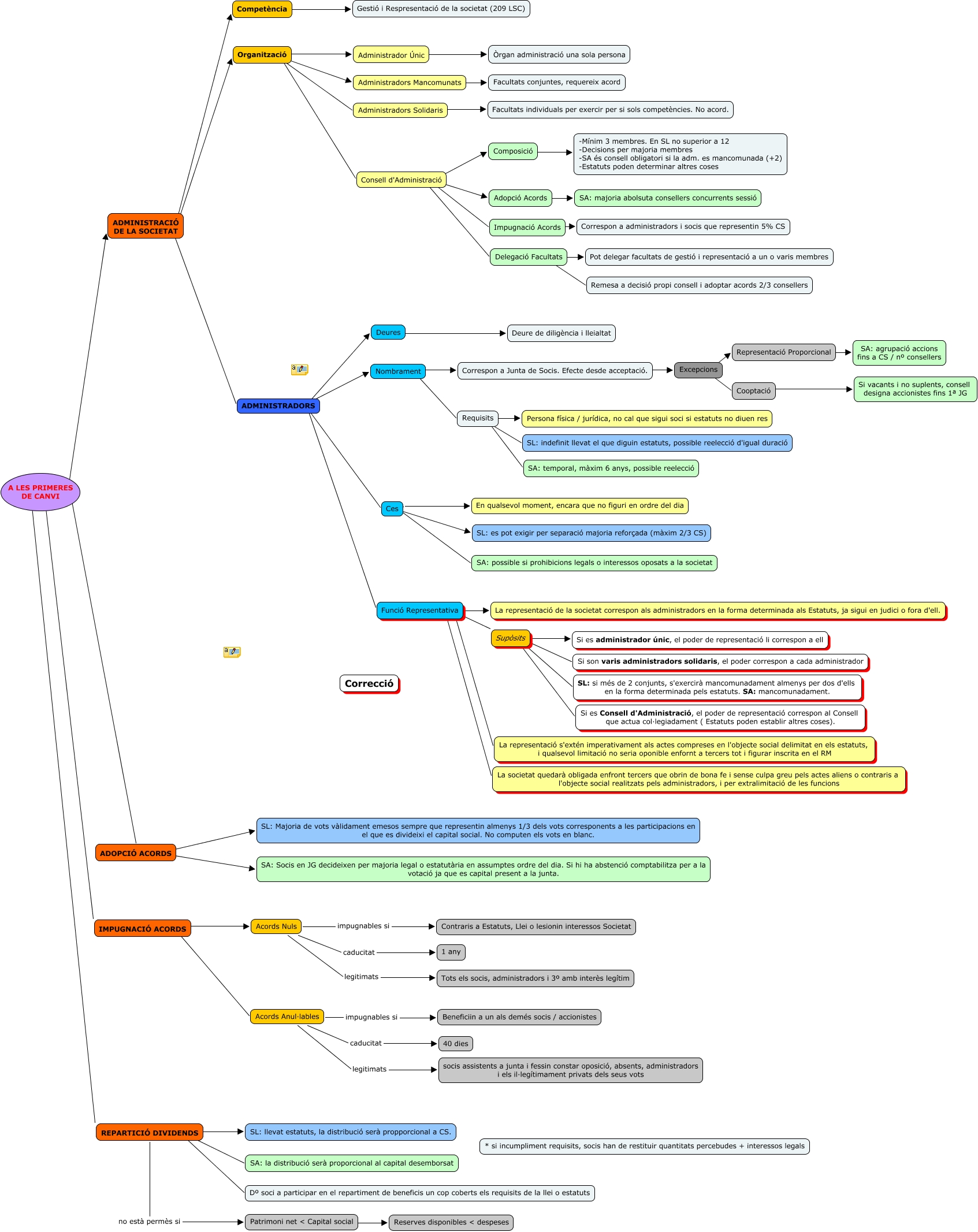 Este Cmap, tiene información relacionada con: Supòsit 6 - A les primeres de canvi (corregit), ADMINISTRADORS ???? Ces, REPARTICIÓ DIVIDENDS ???? SA: la distribució serà proporcional al capital desemborsat, Supòsits ???? Si es Consell d'Administració, el poder de representació correspon al Consell que actua col·legiadament ( Estatuts poden establir altres coses)., Impugnació Acords ???? Correspon a administradors i socis que representin 5% CS, ADMINISTRACIÓ DE LA SOCIETAT ???? Organització, Acords Anul·lables legitimats socis assistents a junta i fessin constar oposició, absents, administradors i els il·legítimament privats dels seus vots, A LES PRIMERES DE CANVI ???? ADMINISTRACIÓ DE LA SOCIETAT, ADMINISTRADORS ???? Nombrament, Requisits ???? Persona física / jurídica, no cal que sigui soci si estatuts no diuen res, Nombrament ???? Correspon a Junta de Socis. Efecte desde acceptació., Funció Representativa ???? Supòsits, Adopció Acords ???? SA: majoria abolsuta consellers concurrents sessió, ADMINISTRADORS ???? Deures, Composició ???? -Mínim 3 membres. En SL no superior a 12 -Decisions per majoria membres -SA és consell obligatori si la adm. es mancomunada (+2) -Estatuts poden determinar altres coses, Deures ???? Deure de diligència i lleialtat, Supòsits ???? Si es administrador únic, el poder de representació li correspon a ell, REPARTICIÓ DIVIDENDS no està permès si Patrimoni net < Capital social, ADMINISTRACIÓ DE LA SOCIETAT ???? Competència, Acords Nuls impugnables si Contraris a Estatuts, Llei o lesionin interessos Societat, Consell d'Administració ???? Delegació Facultats