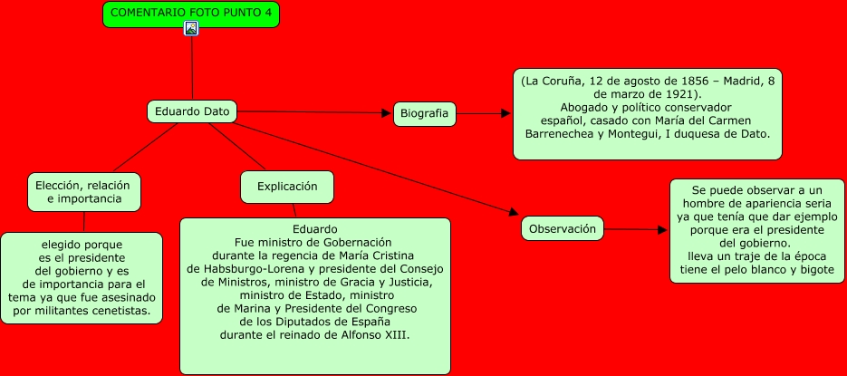 Este Cmap, tiene información relacionada con: comentario foto punto 4, Biografia ???? (La Coruña, 12 de agosto de 1856 – Madrid, 8 de marzo de 1921). Abogado y político conservador español, casado con María del Carmen Barrenechea y Montegui, I duquesa de Dato., Eduardo Dato ???? Explicación, Observación ???? Se puede observar a un hombre de apariencia seria ya que tenía que dar ejemplo porque era el presidente del gobierno. lleva un traje de la época tiene el pelo blanco y bigote, Eduardo Dato ???? Observación, Elección, relación e importancia ???? elegido porque es el presidente del gobierno y es de importancia para el tema ya que fue asesinado por militantes cenetistas., Explicación ???? Eduardo Fue ministro de Gobernación durante la regencia de María Cristina de Habsburgo-Lorena y presidente del Consejo de Ministros, ministro de Gracia y Justicia, ministro de Estado, ministro de Marina y Presidente del Congreso de los Diputados de España durante el reinado de Alfonso XIII., COMENTARIO FOTO PUNTO 4 ???? Eduardo Dato, Eduardo Dato ???? Elección, relación e importancia, Eduardo Dato ???? Biografia
