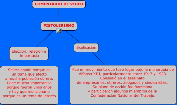 Este Cmap, tiene información relacionada con: comentario de video punto 4, Eleccion, relación e importacia ???? Seleccionado porque es un tema que afectó a mucha población obrera. tiene mucha importancia porque fueron unos años y hay que mencionarlo porque es un tema de interés, COMENTARIO DE VIDEO ???? PISTOLERISMO, PISTOLERISMO ???? Explicación, PISTOLERISMO ???? Eleccion, relación e importacia, Explicación ???? Fue un movimiento que tuvo lugar bajo la monarquía de Alfonso XIII, particularmente entre 1917 y 1923. Consistió en el asesinato de empresarios, obreros, abogados y sindicalistas. Su plano de acción fue Barcelona y participaron algunos miembros de la Confederación Nacional del Trabajo.