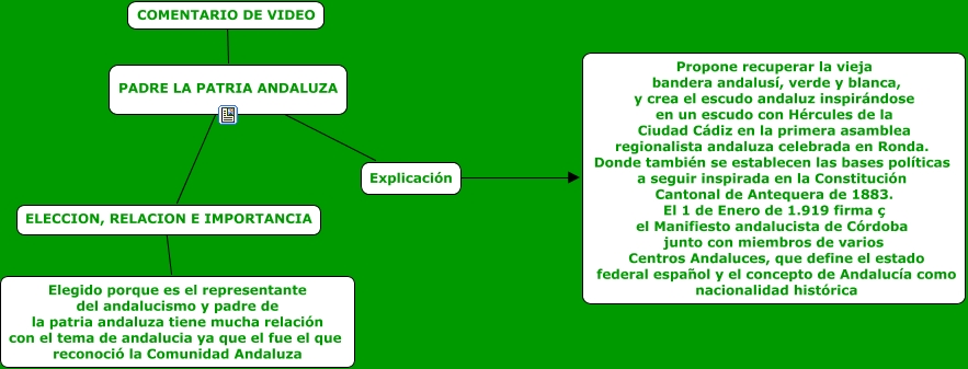Este Cmap, tiene información relacionada con: Comentario de video punto 7, ELECCION, RELACION E IMPORTANCIA ???? Elegido porque es el representante del andalucismo y padre de la patria andaluza tiene mucha relación con el tema de andalucia ya que el fue el que reconoció la Comunidad Andaluza, COMENTARIO DE VIDEO ???? PADRE LA PATRIA ANDALUZA, Explicación ???? Propone recuperar la vieja bandera andalusí, verde y blanca, y crea el escudo andaluz inspirándose en un escudo con Hércules de la Ciudad Cádiz en la primera asamblea regionalista andaluza celebrada en Ronda. Donde también se establecen las bases políticas a seguir inspirada en la Constitución Cantonal de Antequera de 1883. El 1 de Enero de 1.919 firma ç el Manifiesto andalucista de Córdoba junto con miembros de varios Centros Andaluces, que define el estado federal español y el concepto de Andalucía como nacionalidad histórica, PADRE LA PATRIA ANDALUZA ???? ELECCION, RELACION E IMPORTANCIA, PADRE LA PATRIA ANDALUZA ???? Explicación