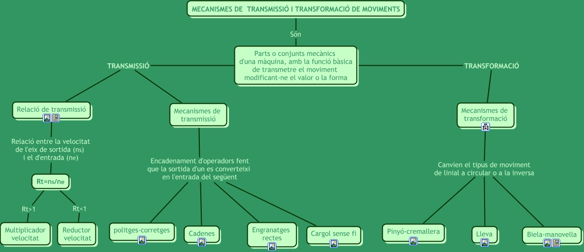 Aquest mapa conceptual conté informació relacionada amb: Mecanismes, Relació de transmissió Relació entre la velocitat de l'eix de sortida (ns) i el d'entrada (ne) Rt=ns/ne, Mecanismes de transmissió Encadenament d'operadors fent que la sortida d'un es converteixi en l'entrada del següent Engranatges rectes, Parts o conjunts mecànics d'una màquina, amb la funció bàsica de transmetre el moviment modificant-ne el valor o la forma TRANSMISSIÓ Relació de transmissió, Mecanismes de transformació Canvien el tipus de moviment de linial a circular o a la inversa Pinyó-cremallera, Mecanismes de transmissió Encadenament d'operadors fent que la sortida d'un es converteixi en l'entrada del següent politges-corretges, Rt=ns/ne Rtə Reductor velocitat, MECANISMES DE TRANSMISSIÓ I TRANSFORMACIÓ DE MOVIMENTS Són Parts o conjunts mecànics d'una màquina, amb la funció bàsica de transmetre el moviment modificant-ne el valor o la forma, Parts o conjunts mecànics d'una màquina, amb la funció bàsica de transmetre el moviment modificant-ne el valor o la forma TRANSFORMACIÓ Mecanismes de transformació, Mecanismes de transformació Canvien el tipus de moviment de linial a circular o a la inversa Lleva, Parts o conjunts mecànics d'una màquina, amb la funció bàsica de transmetre el moviment modificant-ne el valor o la forma TRANSMISSIÓ Mecanismes de transmissió, Mecanismes de transformació Canvien el tipus de moviment de linial a circular o a la inversa Biela-manovella, Mecanismes de transmissió Encadenament d'operadors fent que la sortida d'un es converteixi en l'entrada del següent Cadenes, Rt=ns/ne Rtɭ Multiplicador velocitat, Mecanismes de transmissió Encadenament d'operadors fent que la sortida d'un es converteixi en l'entrada del següent Cargol sense fi