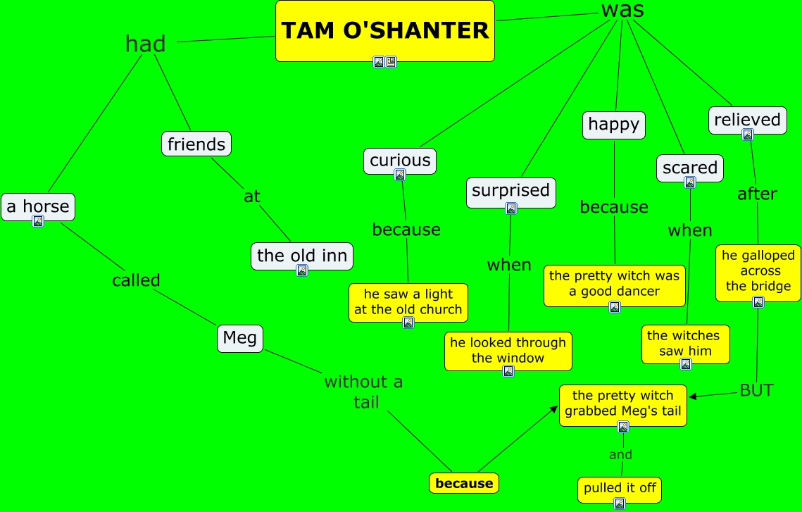 Este Cmap, tiene información relacionada con: Poem, friends at the old inn, curious because he saw a light at the old church, relieved after he galloped across the bridge, a horse called Meg, Meg without a tail because, friends had a horse, surprised when he looked through the window, because the pretty witch grabbed Meg's tail, TAM O'SHANTER was relieved, TAM O'SHANTER was scared, scared when the witches saw him, TAM O'SHANTER was happy, TAM O'SHANTER had a horse, TAM O'SHANTER was surprised, happy because the pretty witch was a good dancer, the pretty witch grabbed Meg's tail and pulled it off, TAM O'SHANTER was curious, he galloped across the bridge BUT the pretty witch grabbed Meg's tail