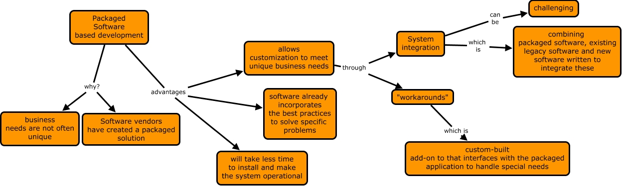This Concept Map, created with IHMC CmapTools, has information related to: packaged software development, Packaged Software based development advantages will take less time to install and make the system operational, allows customization to meet unique business needs through System integration, Packaged Software based development advantages software already incorporates the best practices to solve specific problems, allows customization to meet unique business needs through "workarounds", Packaged Software based development why? Software vendors have created a packaged solution, Packaged Software based development why? business needs are not often unique, System integration can be challenging, "workarounds" which is custom-built add-on to that interfaces with the packaged application to handle special needs, Packaged Software based development advantages allows customization to meet unique business needs, System integration which is combining packaged software, existing legacy software and new software written to integrate these