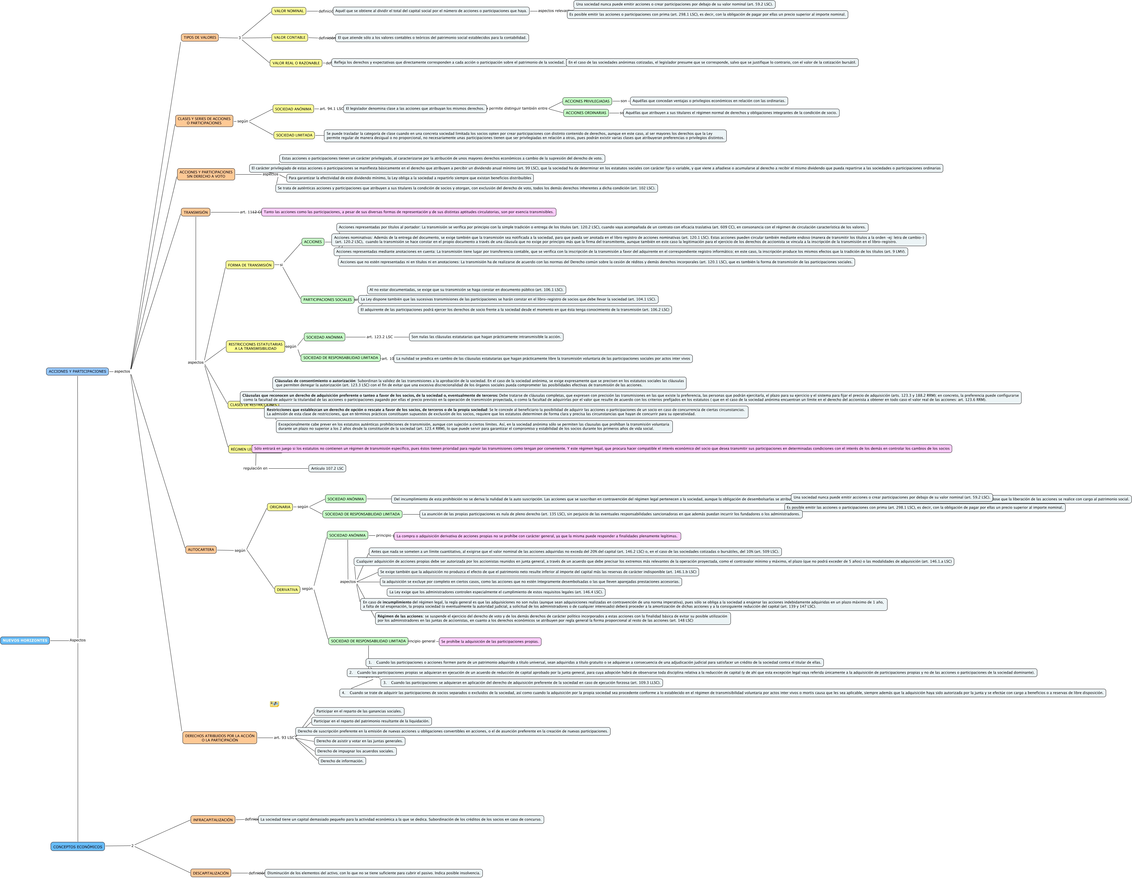 Este Cmap, tiene información relacionada con: Mapa Conceptual 7, RESTRICCIONES ESTATUTARIAS A LA TRANSMISIBILIDAD según SOCIEDAD DE RESPONSABILIDAD LIMITADA, CONCEPTOS ECONÓMICOS 2 DESCAPITALIZACIÓN, DESCAPITALIZACIÓN definición Disminución de los elementos del activo, con lo que no se tiene suficiente para cubrir el pasivo. Indica posible insolvencia., SOCIEDAD ANÓNIMA aspectos Antes que nada se someten a un límite cuantitativo, al exigirse que el valor nominal de las acciones adquiridas no exceda del 20% del capital (art. 146.2 LSC) o, en el caso de las sociedades cotizadas o bursátiles, del 10% (art. 509 LSC)., ACCIONES Y PARTICIPACIONES aspectos CLASES Y SERIES DE ACCIONES O PARTICIPACIONES, SOCIEDAD ANÓNIMA aspectos Cualquier adquisición de acciones propias debe ser autorizada por los accionistas reunidos en junta general, a través de un acuerdo que debe precisar los extremos más relevantes de la operación proyectada, como el contravalor mínimo y máximo, el plazo (que no podrá exceder de 5 años) o las modalidades de adquisición (art. 146.1.a LSC), CLASES DE RESTRICCIONES ???? Restricciones que establezcan un derecho de opción o rescate a favor de los socios, de terceros o de la propia sociedad: Se le concede al beneficiario la posibilidad de adquirir las acciones o participaciones de un socio en caso de concurrencia de ciertas circunstancias. La admisión de esta clase de restricciones, que en términos prácticos constituyen supuestos de exclusión de los socios, requiere que los estatutos determinen de forma clara y precisa las circunstancias que hayan de concurrir para su operatividad., NUEVOS HORIZONTES Aspectos CONCEPTOS ECONÓMICOS, AUTOCARTERA según ORIGINARIA, CLASES Y SERIES DE ACCIONES O PARTICIPACIONES según SOCIEDAD ANÓNIMA, ACCIONES Y PARTICIPACIONES aspectos AUTOCARTERA, SOCIEDAD DE RESPONSABILIDAD LIMITADA excepciones 2. Cuando las participaciones propias se adquieran en ejecución de un acuerdo de reducción de capital aprobado por la junta general, para cuya adopción habrá de observarse toda disciplina relativa a la reducción de capital (y de ahí que esta excepción legal vaya referida únicamente a la adquisición de participaciones propias y no de las acciones o participaciones de la sociedad dominante)., ACCIONES Y PARTICIPACIONES SIN DERECHO A VOTO aspectos Estas acciones o participaciones tienen un carácter privilegiado, al caracterizarse por la atribución de unos mayores derechos económicos a cambio de la supresión del derecho de voto., PARTICIPACIONES SOCIALES caract. La Ley dispone también que las sucesivas transmisiones de las participaciones se harán constar en el libro-registro de socios que debe llevar la sociedad (art. 104.1 LSC)., NUEVOS HORIZONTES Aspectos ACCIONES Y PARTICIPACIONES, SOCIEDAD ANÓNIMA art. 123.2 LSC Son nulas las cláusulas estatutarias que hagan prácticamente intransmisible la acción., SOCIEDAD DE RESPONSABILIDAD LIMITADA excepciones 3. Cuando las participaciones se adquieran en aplicación del derecho de adquisición preferente de la sociedad en caso de ejecución forzosa (art. 109.3 LLSC)., RÉGIMEN LEGAL SUPLETORIO regulación en Artículo 107.2 LSC, DERECHOS ATRIBUIDOS POR LA ACCIÓN O LA PARTICIPACIÓN art. 93 LSC Participar en el reparto de las ganancias sociales., SOCIEDAD ANÓNIMA aspectos la adquisición se excluye por completo en ciertos casos, como las acciones que no estén íntegramente desembolsadas o las que lleven aparejadas prestaciones accesorias.