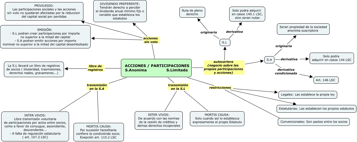 Este Cmap, tiene información relacionada con: Escenario 7, ACCIONES / PARTICIPACIONES S.Anonima S.Limitada acciones sin voto EMISIÓN: - S.L podran crear participaciones por importe no superior a la mitad del capital - S.A podran emitir acciones por importe nominal no superior a la mitad del capital desembolsado, S.A derivativa Solo podra adquirir en casos 144 LSC, ACCIONES / PARTICIPACIONES S.Anonima S.Limitada transmisión en la S.A INTER VIVOS: Libre transmisión voluntaria de participaciones por actos entre socios, como a favor de conyugue, ascendiente, descendiente... - A falta de regulación estatutaria ( art. 107.2 LSC), ACCIONES / PARTICIPACIONES S.Anonima S.Limitada restricciones Estatutarias: Las establecen los propios estatutos, S.L originaria Nula de pleno derecho, ACCIONES / PARTICIPACIONES S.Anonima S.Limitada libro de registros La S.L llevará un libro de registros de socios ( titularidad, trasmisiones, derechos reales, gravamenes...), S.A derivativa condicionada Art. 146 LSC, ACCIONES / PARTICIPACIONES S.Anonima S.Limitada restricciones ????, S.A originaria Seran propiedad de la sociedad anonima suscriptora, ACCIONES / PARTICIPACIONES S.Anonima S.Limitada acciones sin voto DIVIDENDO PREFERENTE: Tendrán derecho a percibir el dividendo anual mínimo fijo o variable que establezca los estatutos, ACCIONES / PARTICIPACIONES S.Anonima S.Limitada transmisión en la S.L MORTIS CAUSA: Solo cuando así lo establezca expresamente el propio Estatuto, ACCIONES / PARTICIPACIONES S.Anonima S.Limitada autocartera (negocio sobre las propias participaciones y acciones) S.L, S.L derivativa Solo podra adquirir en casos 140.1 LSC, sino seran nulas, ACCIONES / PARTICIPACIONES S.Anonima S.Limitada transmisión en la S.A MORTIS CAUSA: Por sucesión hereditaria confiere la condiciónde socio. Exepción art. 110.2 LSC, ACCIONES / PARTICIPACIONES S.Anonima S.Limitada autocartera (negocio sobre las propias participaciones y acciones) S.A, ACCIONES / PARTICIPACIONES S.Anonima S.Limitada restricciones Legales: Las establece la propia ley, ACCIONES / PARTICIPACIONES S.Anonima S.Limitada transmisión en la S.L INTER VIVOS: De acuerdo con las normas de la cesión de créditos y demas derechos incoporales, ACCIONES / PARTICIPACIONES S.Anonima S.Limitada acciones sin voto PRIVILEGIO: Las participaciones sociales y las acciones sin voto no quedaran afectadas por la reduccion del capital social por perdidas
