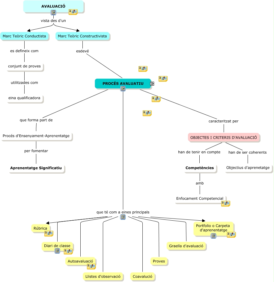 Este Cmap, tiene información relacionada con: avaluacio - cmap general, PROCÉS AVALUATIU que forma part de Procés d'Ensenyament-Aprenentatge, conjunt de proves utilitzades com eina qualificadora, OBJECTES I CRITERIS D'AVALUACIÓ han de tenir en compte Competències, PROCÉS AVALUATIU que té com a eines principals Rúbrica, PROCÉS AVALUATIU que té com a eines principals Diari de classe, Procés d'Ensenyament-Aprenentatge per fomentar Aprenentatge Significatiu, PROCÉS AVALUATIU que té com a eines principals Autoavaluació, AVALUACIÓ vista des d'un Marc Teòric Constructivista, Marc Teòric Conductista es defineix com conjunt de proves, PROCÉS AVALUATIU caracteritzat per OBJECTES I CRITERIS D'AVALUACIÓ, OBJECTES I CRITERIS D'AVALUACIÓ han de ser coherents Objectius d'aprenetatge, Competències amb Enfocament Competencial, Marc Teòric Constructivista esdevé PROCÉS AVALUATIU, PROCÉS AVALUATIU que té com a eines principals Coavalució, AVALUACIÓ vista des d'un Marc Teòric Conductista, PROCÉS AVALUATIU que té com a eines principals Proves, PROCÉS AVALUATIU que té com a eines principals Graella d'avaluació, PROCÉS AVALUATIU que té com a eines principals Portfolio o Carpeta d'aprenentatge, PROCÉS AVALUATIU que té com a eines principals Llistes d'observació