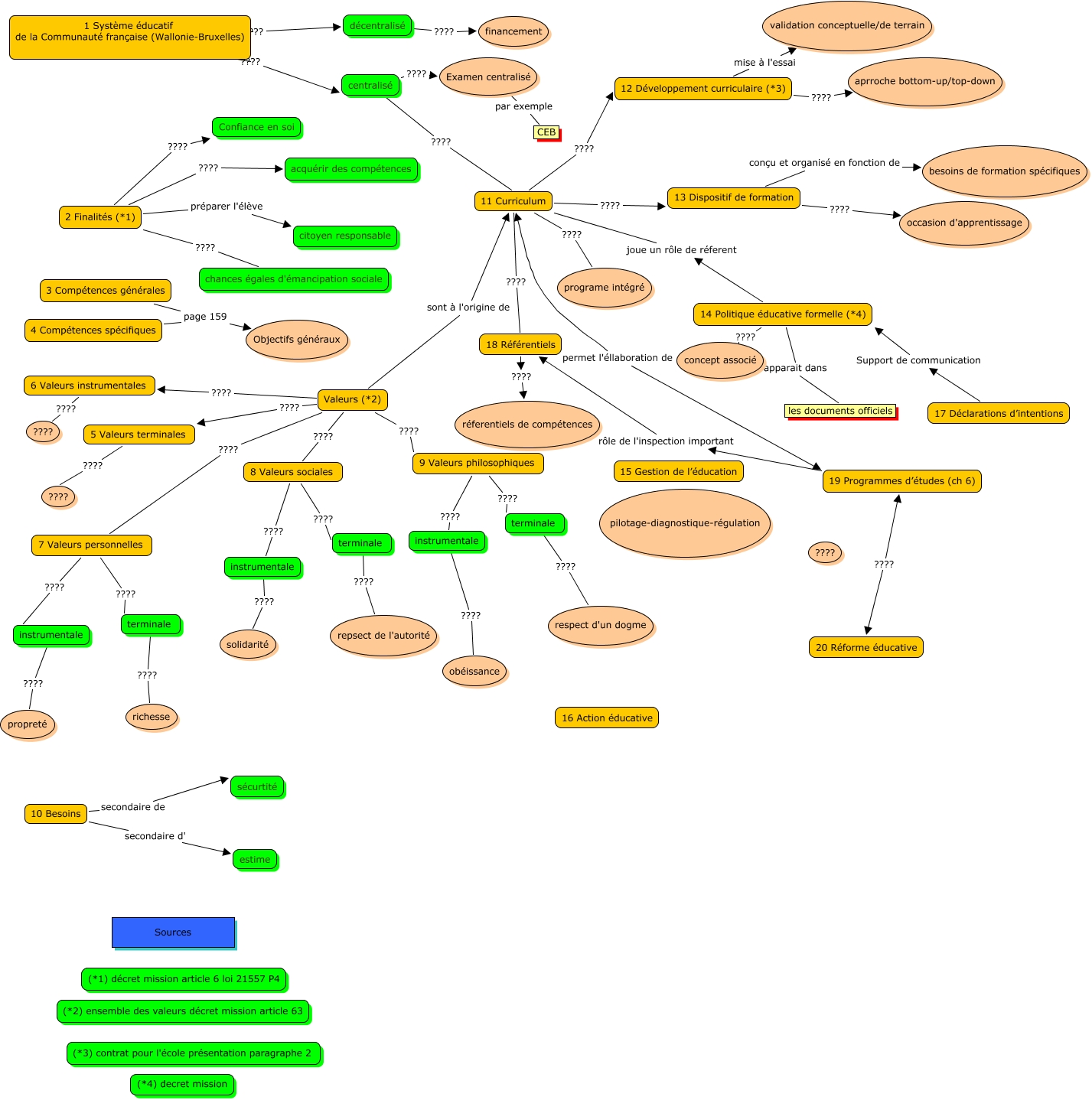 Cette carte de concepts créée avec IHMC CmapTools traite de: carte conceptuelle version 1.cmap, Valeurs (*2) ???? 5 Valeurs terminales, 2 Finalités (*1) ???? acquérir des compétences, 11 Curriculum ???? programe intégré, 13 Dispositif de formation conçu et organisé en fonction de besoins de formation spécifiques, Valeurs (*2) ???? 9 Valeurs philosophiques, 3 Compétences générales page 159 Objectifs généraux, 12 Développement curriculaire (*3) ???? aprroche bottom-up/top-down, 1 Système éducatif de la Communauté française (Wallonie-Bruxelles) ???? centralisé, 8 Valeurs sociales ???? instrumentale, Valeurs (*2) ???? 7 Valeurs personnelles, Valeurs (*2) ???? 6 Valeurs instrumentales, Examen centralisé par exemple CEB, Valeurs (*2) sont à l'origine de 11 Curriculum, décentralisé ???? financement, terminale ???? respect d'un dogme, 7 Valeurs personnelles ???? instrumentale, 5 Valeurs terminales ???? ????, 14 Politique éducative formelle (*4) ???? concept associé, centralisé ???? 11 Curriculum, 1 Système éducatif de la Communauté française (Wallonie-Bruxelles) ???? décentralisé