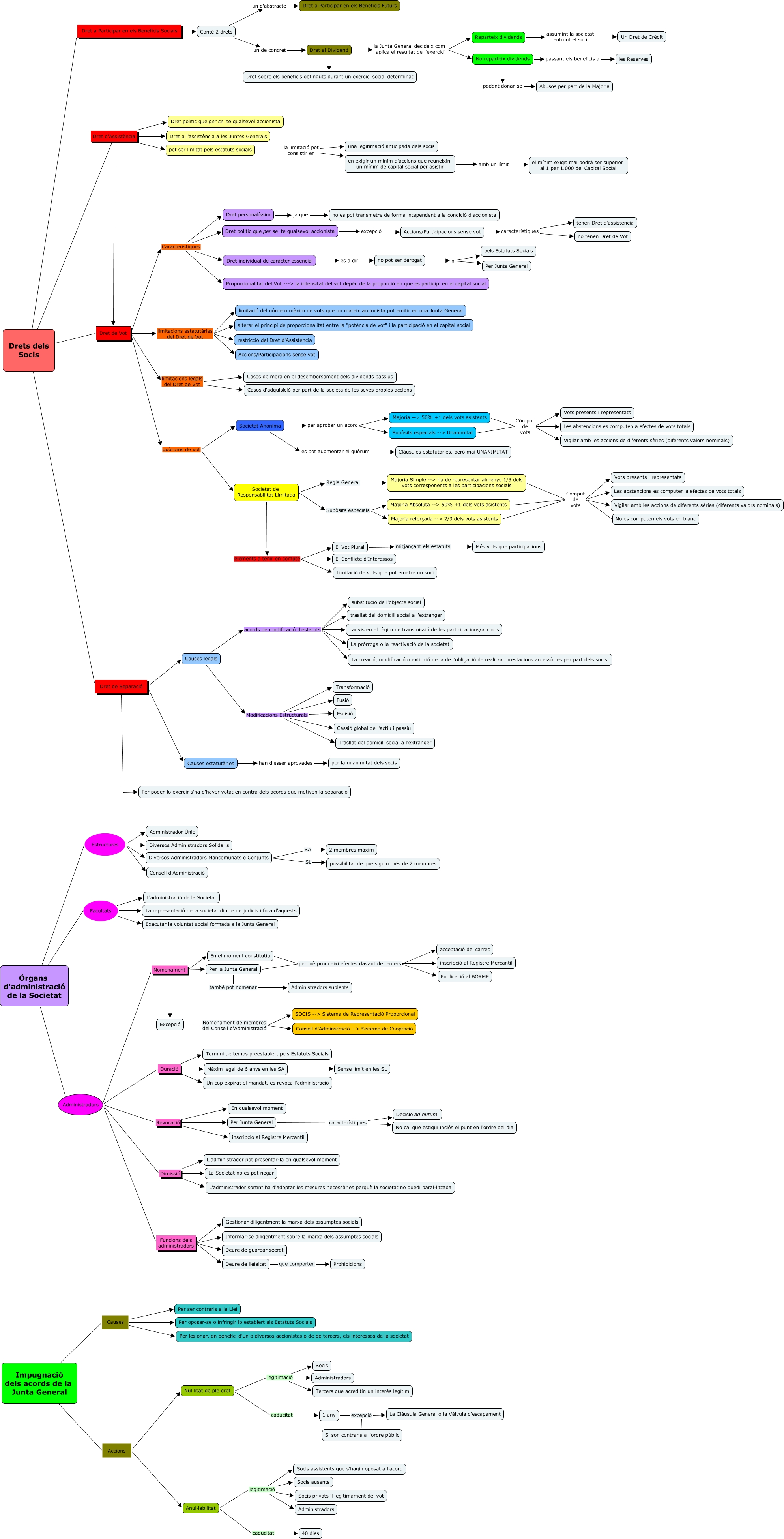 Este Cmap, tiene información relacionada con: Cas 6 Lluís Ricart, 1 any excepció La Clàusula General o la Vàlvula d'escapament, Societat de Responsabilitat Limitada Supòsits especials Majoria Absoluta --> 50% +1 dels vots asistents, Causes legals acords de modificació d'estatuts canvis en el règim de transmissió de les participacions/accions, Administradors Duració Màxim legal de 6 anys en les SA, Majoria Simple --> ha de representar almenys 1/3 dels vots corresponents a les participacions socials Còmput de vots No es computen els vots en blanc, Nul·litat de ple dret legitimació Socis, Màxim legal de 6 anys en les SA ???? Sense límit en les SL, no pot ser derogat ni pels Estatuts Socials, Societat de Responsabilitat Limitada Supòsits especials Majoria reforçada --> 2/3 dels vots asistents, No reparteix dividends podent donar-se Abusos per part de la Majoria, Causes legals Modificacions Estructurals Trasllat del domicili social a l'extranger, Majoria Simple --> ha de representar almenys 1/3 dels vots corresponents a les participacions socials Còmput de vots Les abstencions es computen a efectes de vots totals, Dret de Vot Característiques Dret individual de caràcter essencial, Causes legals acords de modificació d'estatuts trasllat del domicili social a l'extranger, Impugnació dels acords de la Junta General Accions Anul·labilitat, Administradors Duració Un cop expirat el mandat, es revoca l'administració, Supòsits especials --> Unanimitat Còmput de vots Vigilar amb les accions de diferents sèries (diferents valors nominals), Societat de Responsabilitat Limitada Regla General Majoria Simple --> ha de representar almenys 1/3 dels vots corresponents a les participacions socials, No reparteix dividends passant els beneficis a les Reserves, Administradors Revocació inscripció al Registre Mercantil