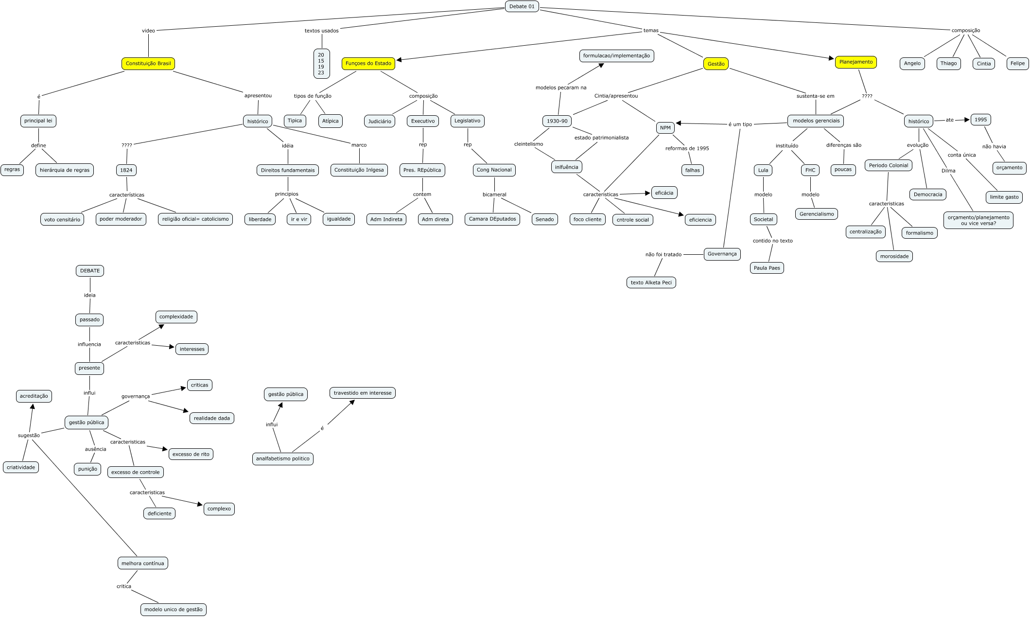 Esse mapa conceitual, produzido no IHMC CmapTools, tem a informação relacionada a: debate 01 ap2012, 1995 não havia orçamento, principal lei define hierárquia de regras, modelos gerenciais diferenças são poucas, Debate 01 composição Felipe, histórico ate 1995, histórico evolução Periodo Colonial, Funçoes do Estado composição Executivo, presente caracteristicas complexidade, gestão pública caracteristicas excesso de controle, gestão pública sugestão acreditação, Debate 01 temas Gestão, Periodo Colonial caracteristicas formalismo, NPM caracteristicas eficiencia, melhora contínua critica modelo unico de gestão, Governança não foi tratado texto Alketa Peci, Periodo Colonial caracteristicas morosidade, principal lei define regras, Debate 01 temas Funçoes do Estado, Pres. REpública contem Adm direta, Societal contido no texto Paula Paes