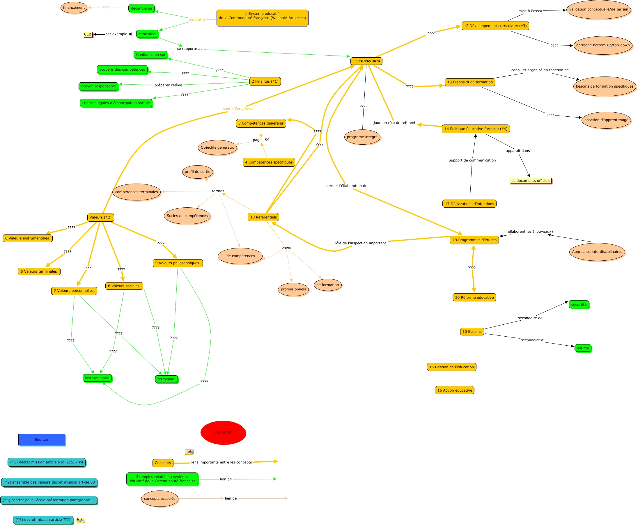 Cette carte de concepts créée avec IHMC CmapTools traite de: carte conceptuelle version 2 modif angès & elo, 18 Référentiels termes compétences terminales, 11 Curriculum ???? programe intégré, Concepts liens importants entre les concepts ????, 18 Référentiels types de formation, 3 Compétences générales page 159 Objectifs généraux, 13 Dispositif de formation ???? occasion d'apprentissage, 18 Référentiels termes Socles de compétences, 11 Curriculum ???? 13 Dispositif de formation, Valeurs (*2) sont à l'origine de 11 Curriculum, Valeurs (*2) ???? 8 Valeurs sociales, 12 Développement curriculaire (*3) mise à l'essai validation conceptuelle/de terrain, 14 Politique éducative formelle (*4) apparait dans les documents officiels, 18 Référentiels types de compétences, 2 Finalités (*1) ???? chances égales d'émancipation sociale, 17 Déclarations d’intentions Support de communication 14 Politique éducative formelle (*4), 10 Besoins secondaire de sécurtité, Exemples relatifs au système éducatif de la Communauté française lien de ????, 11 Curriculum ???? 18 Référentiels, 18 Référentiels termes de compétences, 1 Système éducatif de la Communauté française (Wallonie-Bruxelles) peut être centralisé