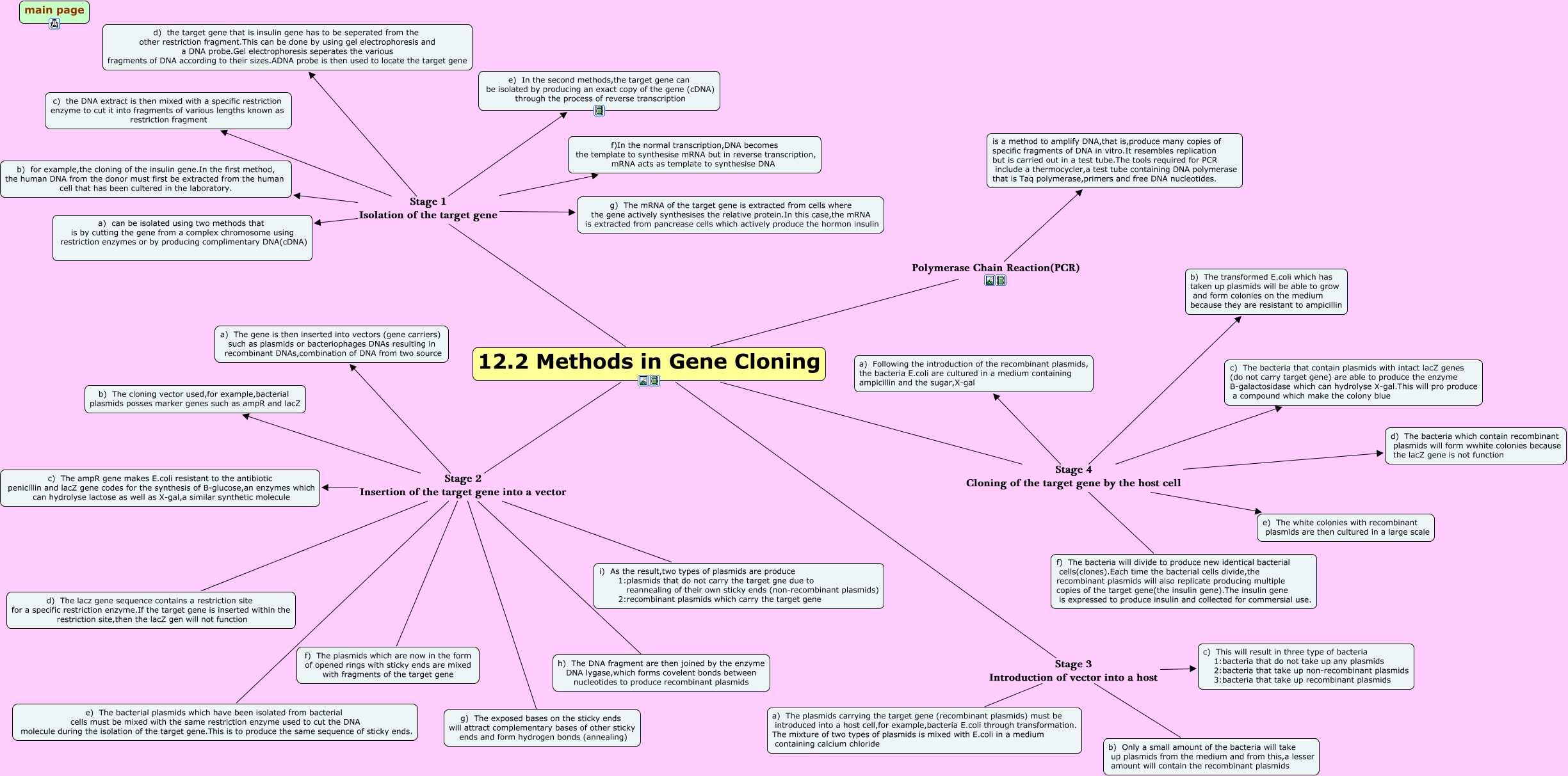 This Concept Map, created with IHMC CmapTools, has information related to: 12.2 Methods in Gene Cloning, 12.2 Methods in Gene Cloning Stage 2 Insertion of the target gene into a vector d) The lacz gene sequence contains a restriction site for a specific restriction enzyme.If the target gene is inserted within the restriction site,then the lacZ gen will not function, 12.2 Methods in Gene Cloning Stage 3 Introduction of vector into a host a) The plasmids carrying the target gene (recombinant plasmids) must be introduced into a host cell,for example,bacteria E.coli through transformation. The mixture of two types of plasmids is mixed with E.coli in a medium containing calcium chloride, 12.2 Methods in Gene Cloning Stage 4 Cloning of the target gene by the host cell e) The white colonies with recombinant plasmids are then cultured in a large scale, 12.2 Methods in Gene Cloning Stage 4 Cloning of the target gene by the host cell d) The bacteria which contain recombinant plasmids will form wwhite colonies because the lacZ gene is not function, 12.2 Methods in Gene Cloning Stage 1 Isolation of the target gene c) the DNA extract is then mixed with a specific restriction enzyme to cut it into fragments of various lengths known as restriction fragment, 12.2 Methods in Gene Cloning Stage 4 Cloning of the target gene by the host cell a) Following the introduction of the recombinant plasmids, the bacteria E.coli are cultured in a medium containing ampicillin and the sugar,X-gal, 12.2 Methods in Gene Cloning Stage 1 Isolation of the target gene a) can be isolated using two methods that is by cutting the gene from a complex chromosome using restriction enzymes or by producing complimentary DNA(cDNA), 12.2 Methods in Gene Cloning Stage 1 Isolation of the target gene d) the target gene that is insulin gene has to be seperated from the other restriction fragment.This can be done by using gel electrophoresis and a DNA probe.Gel electrophoresis seperates the various fragments of DNA according to their sizes.ADNA probe is then used to locate the target gene, 12.2 Methods in Gene Cloning Stage 3 Introduction of vector into a host c) This will result in three type of bacteria 1:bacteria that do not take up any plasmids 2:bacteria that take up non-recombinant plasmids 3:bacteria that take up recombinant plasmids, 12.2 Methods in Gene Cloning Stage 4 Cloning of the target gene by the host cell b) The transformed E.coli which has taken up plasmids will be able to grow and form colonies on the medium because they are resistant to ampicillin, 12.2 Methods in Gene Cloning Stage 2 Insertion of the target gene into a vector f) The plasmids which are now in the form of opened rings with sticky ends are mixed with fragments of the target gene, 12.2 Methods in Gene Cloning Stage 4 Cloning of the target gene by the host cell c) The bacteria that contain plasmids with intact lacZ genes (do not carry target gene) are able to produce the enzyme B-galactosidase which can hydrolyse X-gal.This will pro produce a compound which make the colony blue, 12.2 Methods in Gene Cloning Stage 3 Introduction of vector into a host b) Only a small amount of the bacteria will take up plasmids from the medium and from this,a lesser amount will contain the recombinant plasmids, 12.2 Methods in Gene Cloning Stage 2 Insertion of the target gene into a vector i) As the result,two types of plasmids are produce 1:plasmids that do not carry the target gne due to reannealing of their own sticky ends (non-recombinant plasmids) 2:recombinant plasmids which carry the target gene, 12.2 Methods in Gene Cloning Stage 1 Isolation of the target gene g) The mRNA of the target gene is extracted from cells where the gene actively synthesises the relative protein.In this case,the mRNA is extracted from pancrease cells which actively produce the hormon insulin, 12.2 Methods in Gene Cloning Stage 2 Insertion of the target gene into a vector e) The bacterial plasmids which have been isolated from bacterial cells must be mixed with the same restriction enzyme used to cut the DNA molecule during the isolation of the target gene.This is to produce the same sequence of sticky ends., 12.2 Methods in Gene Cloning Stage 2 Insertion of the target gene into a vector a) The gene is then inserted into vectors (gene carriers) such as plasmids or bacteriophages DNAs resulting in recombinant DNAs,combination of DNA from two source, 12.2 Methods in Gene Cloning Stage 1 Isolation of the target gene b) for example,the cloning of the insulin gene.In the first method, the human DNA from the donor must first be extracted from the human cell that has been cultered in the laboratory., 12.2 Methods in Gene Cloning Stage 2 Insertion of the target gene into a vector b) The cloning vector used,for example,bacterial plasmids posses marker genes such as ampR and lacZ, 12.2 Methods in Gene Cloning Stage 4 Cloning of the target gene by the host cell f) The bacteria will divide to produce new identical bacterial cells(clones).Each time the bacterial cells divide,the recombinant plasmids will also replicate producing multiple copies of the target gene(the insulin gene).The insulin gene is expressed to produce insulin and collected for commersial use.