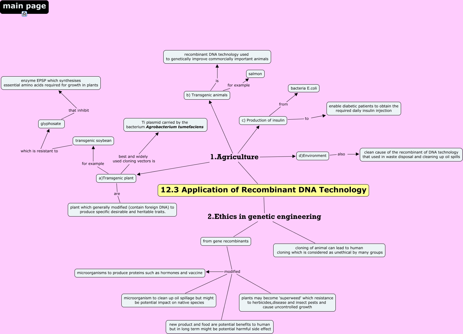 This Concept Map, created with IHMC CmapTools, has information related to: 12.3 Apllication of Recombinant Technology, 12.3 Application of Recombinant DNA Technology 1.Agriculture b) Transgenic animals, a)Transgenic plant best and widely used cloning vectors is Ti plasmid carried by the bacterium Agrobacterium tumefaciens, 12.3 Application of Recombinant DNA Technology 2.Ethics in genetic engineering from gene recombinants, 12.3 Application of Recombinant DNA Technology 2.Ethics in genetic engineering cloning of animal can lead to human cloning which is considered as unethical by many groups, from gene recombinants modified plants may become 'superweed' which resistance to herbicides,disease and insect pests and cause uncontrolled growth, c) Production of insulin to enable diabetic patients to obtain the required daily insulin injection, from gene recombinants modified new product and food are potential benefits to human but in long term might be potential harmful side effect, 12.3 Application of Recombinant DNA Technology 1.Agriculture a)Transgenic plant, b) Transgenic animals for example salmon, d)Environment also clean cause of the recombinant of DNA technology that used in waste disposal and cleaning up oil spills, 12.3 Application of Recombinant DNA Technology 1.Agriculture c) Production of insulin, b) Transgenic animals is recombinant DNA technology used to genetically improve commorcially important animals, transgenic soybean which is resistant to glyphosate, from gene recombinants modified microorganism to clean up oil spillage but might be potential impact on native species, from gene recombinants modified microorganisms to produce proteins such as hormones and vaccine, a)Transgenic plant for example transgenic soybean, 12.3 Application of Recombinant DNA Technology 1.Agriculture d)Environment, a)Transgenic plant are plant which generally modified (contain foreign DNA) to produce specific desirable and heritable traits., c) Production of insulin from bacteria E.coli, glyphosate that inhibit enzyme EPSP which synthesises essential amino acids required for growth in plants