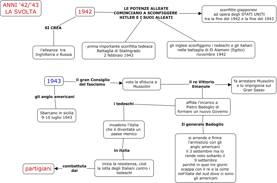 Questa Cmap, creata con IHMC CmapTools, contiene informazioni relative a: storia - Seconda guerra mondiale III parte (s.m), 1943 gli anglo americani Sbarcano in sicilia 9-10 luglio 1943, 1942 LE POTENZE ALLEATE COMINCIANO A SCONFIGGERE HITLER E I SUOI ALLEATI gli inglesi sconfiggono i tedeschi e gli italiani nella battaglia di El Alamein (Egitto) novembre 1942, 1942 LE POTENZE ALLEATE COMINCIANO A SCONFIGGERE HITLER E I SUOI ALLEATI sconfitte giapponesi ad opera degli STATI UNITI tra la fine del 1942 e la fine del 1943, 1942 LE POTENZE ALLEATE COMINCIANO A SCONFIGGERE HITLER E I SUOI ALLEATI · prima importante sconfitta tedesca Battaglia di Stalingrado 2 febbraio 1943, 1943 il gran Consiglio del fascismo vota la sfiducia a Mussolini, invadono l'italia che è diventata un paese menico in italia inizia la resistenza, cioè la lotta degli Italiani contro i tedeschi, vota la sfiducia a Mussolini il re Vittorio Emanule fa arrestare Mussolini e lo imprigiona sul Gran Sasso, 1942 SI CREA l'alleanza tra Inghilterra e Russia, inizia la resistenza, cioè la lotta degli Italiani contro i tedeschi combattuta dai partigiani, vota la sfiducia a Mussolini il re Vittorio Emanule affida l'incarico a Pietro Badoglio di formare un nuovo Governo, affida l'incarico a Pietro Badoglio di formare un nuovo Governo i tedeschi invadono l'italia che è diventata un paese menico, affida l'incarico a Pietro Badoglio di formare un nuovo Governo Il generale Badoglio si arrende e firma l'armistizio con gli anglo americani il 3 settembre ma lo rende noto soltanto il 9 settembre perchè in quei tre giorni scappa con il re e la corte nell'italia del sud dove ci sono gli americani