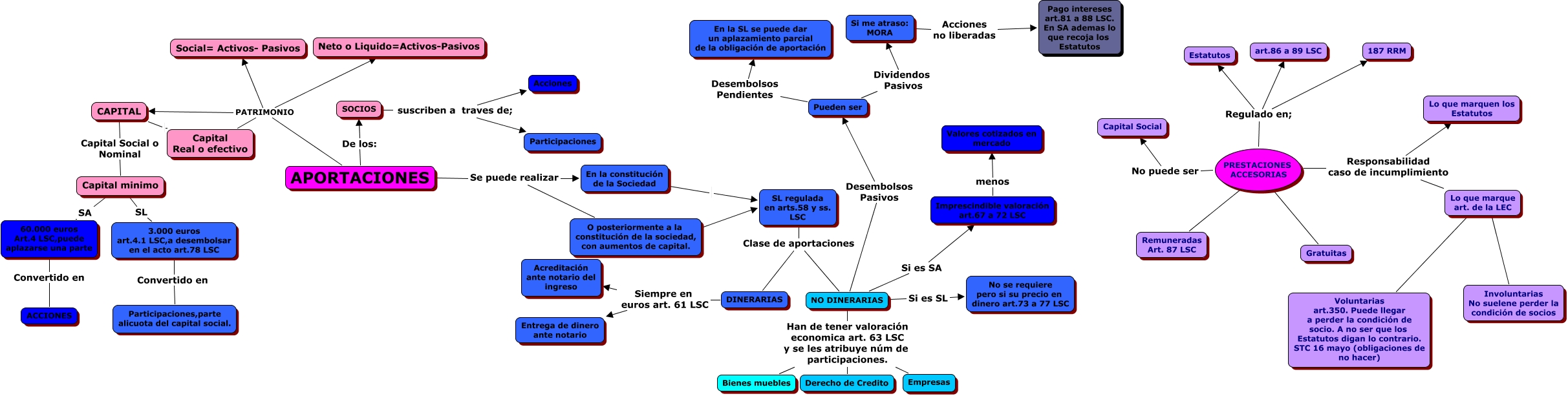 Este Cmap, tiene información relacionada con: 2.-Comencem a rutllar, Lo que marque art. de la LEC Involuntarias No suelene perder la condición de socios, DINERARIAS Siempre en euros art. 61 LSC Acreditación ante notario del ingreso, 60.000 euros Art.4 LSC,puede aplazarse una parte Convertido en ACCIONES, O posteriormente a la constitución de la sociedad, con aumentos de capital. SL regulada en arts.58 y ss. LSC, SL regulada en arts.58 y ss. LSC Clase de aportaciones NO DINERARIAS, SOCIOS suscriben a traves de; Acciones, APORTACIONES PATRIMONIO CAPITAL, APORTACIONES Se puede realizar O posteriormente a la constitución de la sociedad, con aumentos de capital., NO DINERARIAS Desembolsos Pasivos Pueden ser, DINERARIAS Siempre en euros art. 61 LSC Entrega de dinero ante notario, NO DINERARIAS Han de tener valoración economica art. 63 LSC y se les atribuye núm de participaciones. Empresas, CAPITAL Capital Social o Nominal Capital minimo, Si me atraso: MORA Acciones no liberadas Pago intereses art.81 a 88 LSC. En SA ademas lo que recoja los Estatutos, PRESTACIONES ACCESORIAS Regulado en; art.86 a 89 LSC, CAPITAL Capital Real o efectivo, PRESTACIONES ACCESORIAS Responsabilidad caso de incumplimiento Lo que marquen los Estatutos, NO DINERARIAS Han de tener valoración economica art. 63 LSC y se les atribuye núm de participaciones. Bienes muebles, PRESTACIONES ACCESORIAS Gratuitas, Capital minimo SL 3.000 euros art.4.1 LSC,a desembolsar en el acto art.78 LSC, Pueden ser Dividendos Pasivos Si me atraso: MORA