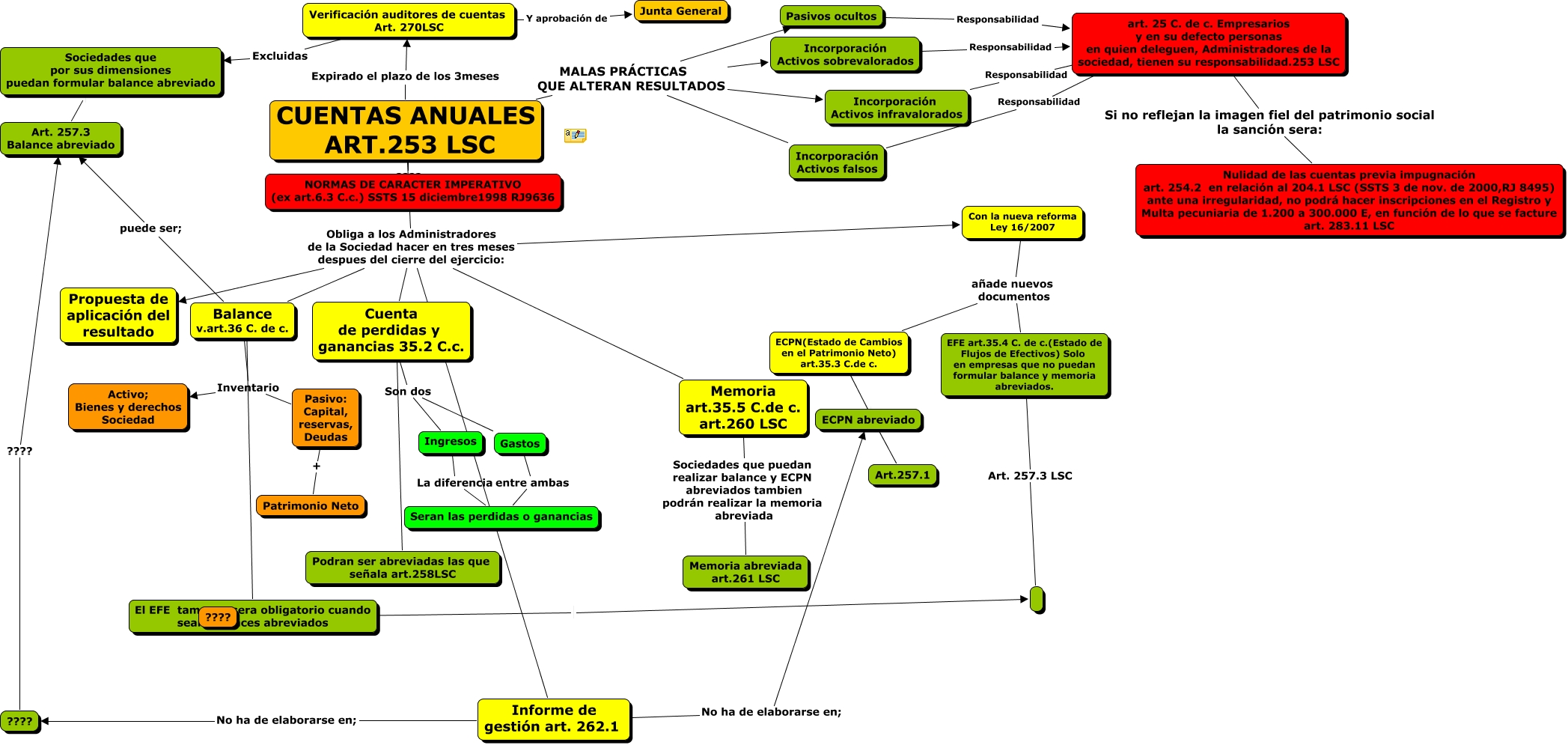 Este Cmap, tiene información relacionada con: 3.-fent números, Balance v.art.36 C. de c. Inventario Pasivo: Capital, reservas, Deudas, Cuenta de perdidas y ganancias 35.2 C.c. Podran ser abreviadas las que señala art.258LSC, Pasivo: Capital, reservas, Deudas + Patrimonio Neto, CUENTAS ANUALES ART.253 LSC MALAS PRÁCTICAS QUE ALTERAN RESULTADOS Pasivos ocultos, Balance v.art.36 C. de c. Inventario Activo; Bienes y derechos Sociedad, ????, CUENTAS ANUALES ART.253 LSC ???? NORMAS DE CARACTER IMPERATIVO (ex art.6.3 C.c.) SSTS 15 diciembre1998 RJ9636, Balance v.art.36 C. de c. puede ser; Art. 257.3 Balance abreviado, CUENTAS ANUALES ART.253 LSC Obliga a los Administradores de la Sociedad hacer en tres meses despues del cierre del ejercicio: Memoria art.35.5 C.de c. art.260 LSC, Ingresos La diferencia Seran las perdidas o ganancias, CUENTAS ANUALES ART.253 LSC Obliga a los Administradores de la Sociedad hacer en tres meses despues del cierre del ejercicio: Informe de gestión art. 262.1, Balance v.art.36 C. de c. El EFE tampoco sera obligatorio cuando sean balances abreviados, Con la nueva reforma Ley 16/2007 añade nuevos documentos ECPN(Estado de Cambios en el Patrimonio Neto) art.35.3 C.de c., Memoria art.35.5 C.de c. art.260 LSC Sociedades que puedan realizar balance y ECPN abreviados tambien podrán realizar la memoria abreviada Memoria abreviada art.261 LSC, art. 25 C. de c. Empresarios y en su defecto personas en quien deleguen, Administradores de la sociedad, tienen su responsabilidad.253 LSC Si no reflejan la imagen fiel del patrimonio social la sanción sera: Nulidad de las cuentas previa impugnación art. 254.2 en relación al 204.1 LSC (SSTS 3 de nov. de 2000,RJ 8495) ante una irregularidad, no podrá hacer inscripciones en el Registro y Multa pecuniaria de 1.200 a 300.000 E, en función de lo que se facture art. 283.11 LSC, ???? ???? Art. 257.3 Balance abreviado, Sociedades que por sus dimensiones puedan formular balance abreviado Art. 257.3 Balance abreviado, Pasivos ocultos Responsabilidad art. 25 C. de c. Empresarios y en su defecto personas en quien deleguen, Administradores de la sociedad, tienen su responsabilidad.253 LSC, Cuenta de perdidas y ganancias 35.2 C.c. Son dos Gastos, CUENTAS ANUALES ART.253 LSC Obliga a los Administradores de la Sociedad hacer en tres meses despues del cierre del ejercicio: Con la nueva reforma Ley 16/2007