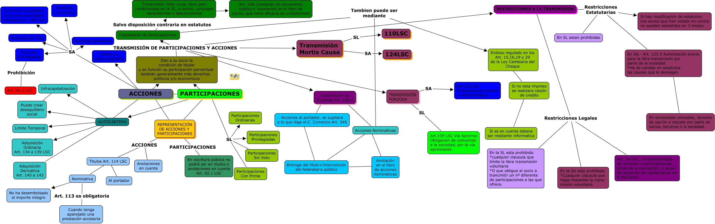 Este Cmap, tiene información relacionada con: 7.-nous horitzons, RESTRICCIONES A LA TRANSMISION Restricciones Estatutarias En SL estan prohibidas, ACCIONES ???? Tienen un valor mobiliario, ACCIONES SA Acciones Ordinarias, Transmisión de Participaciones Tambien puede ser mediante Endoso regulado en los Art. 15,16,19 y 29 de la Ley Cambiaria del Cheque, ACCIONES SA Acciones Privilegiadas, TRANSMISIÓN FORZOSA SA Art.125 LSC Procedimiento Judicial o Administrativo, Transmisión de Participaciones Salvo disposición contraria en estatutos Transmisión Inter vivos, libre pero condicionada en la SL, a socios, conyuges ascendientes y descencientes, PARTICIPACIONES ???? Dan a su socio la condición de titular y en función su participación porcentual tendrán generalmente más derechos politicos y/o economicos, ACCIONES ???? Dan a su socio la condición de titular y en función su participación porcentual tendrán generalmente más derechos politicos y/o economicos, REPRESENTACIÓN DE ACCIONES Y PARTICIPACIONES ACCIONES Titulos Art. 114 LSC, ACCIONES SA Acciones sin Voto, ACCIONES AUTOCARTERA Puede crear desequilibrio social, Titulos Art. 114 LSC ???? Nominativa, TRANSMISIÓN FORZOSA SL Art.109 LSC Vía Apremio Obligación de comunicar a la sociedad, por la vía apremiante., PARTICIPACIONES SL Participaciones Ordinarias, Puede crear desequilibrio social ???? Infracapitalización, Dan a su socio la condición de titular y en función su participación porcentual tendrán generalmente más derechos politicos y/o economicos TRANSMISIÓN DE PARTICIPACIONES Y ACCIONES TRANSMISIÓN FORZOSA, Transmisión Mortis Causa SL 110LSC, Acciones Nominativas ???? Anotación en el libro de acciones nominativas, ACCIONES SA Acciones con primas