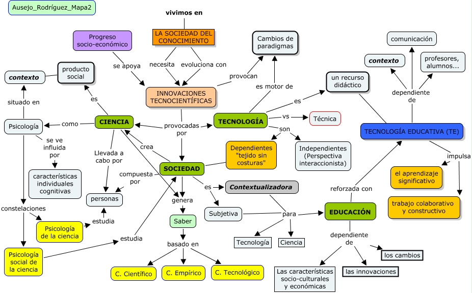 Este Cmap, tiene información relacionada con: PEC1.3_Ausejo_Rodríguez_(Mapa2), TECNOLOGÍA es un recurso didáctico, CIENCIA genera Saber, TECNOLOGÍA EDUCATIVA (TE) dependiente de comunicación, LA SOCIEDAD DEL CONOCIMIENTO evoluciona con INNOVACIONES TECNOCIENTÍFICAS, Psicología situado en contexto, Progreso socio-económico se apoya INNOVACIONES TECNOCIENTÍFICAS, Subjetiva para Ciencia, SOCIEDAD es Contextualizadora, Subjetiva para Tecnología, Contextualizadora para Tecnología, vivimos en ???? ????, EDUCACIÓN dependiente de las innovaciones, Contextualizadora para Ciencia, EDUCACIÓN dependiente de los cambios, SOCIEDAD compuesta por personas, SOCIEDAD ???? Dependientes "tejido sin costuras", TECNOLOGÍA EDUCATIVA (TE) dependiente de contexto, TECNOLOGÍA vs Técnica, SOCIEDAD genera Saber, TECNOLOGÍA son Independientes (Perspectiva interaccionista)