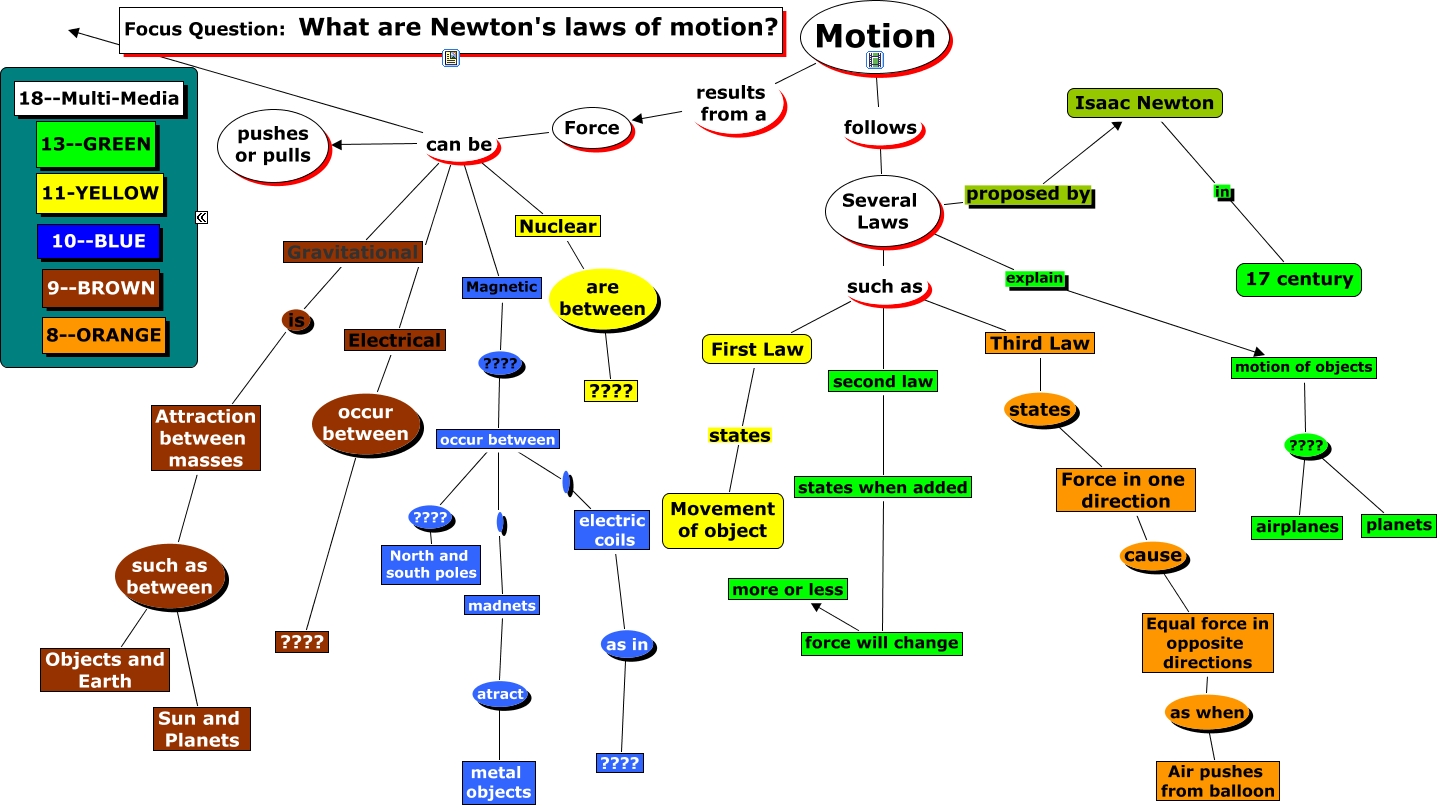 This Concept Map, created with IHMC CmapTools, has information related to: Copy (3) of spare map NEWTON LAWS Owen Gordon, Several Laws such as First Law, Equal force in opposite directions as when Air pushes from balloon, Several Laws explain motion of objects, Magnetic ???? occur between, Third Law states Force in one direction, Gravitational is Attraction between masses, Several Laws such as Third Law, Motion results from a Force, force will change more or less, Force can be Nuclear, electric coils as in ????, occur between electric coils, Force can be Electrical, occur between ???? North and south poles, Attraction between masses such as between Objects and Earth, Force can be Gravitational, Nuclear are between ????, madnets atract metal objects, Isaac Newton in 17 century, Attraction between masses such as between Sun and Planets