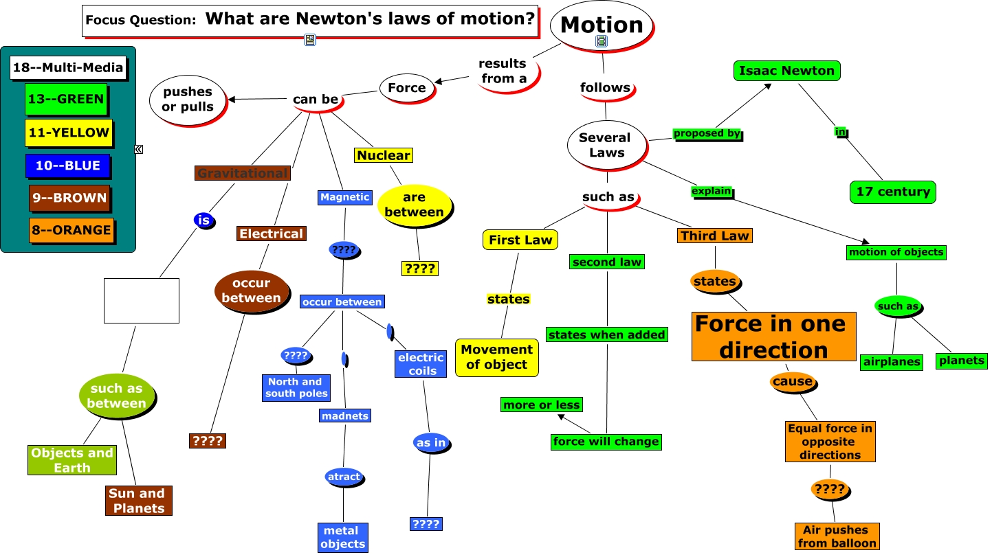 This Concept Map, created with IHMC CmapTools, has information related to: Copy (3) of spare map NEWTON LAWS grace lombardi, force will change more or less, Force can be Nuclear, second law states when added, electric coils as in ????, motion of objects such as planets, Force can be Gravitational, Force can be Magnetic, Motion results from a Force, Nuclear are between ????, Several Laws such as second law, motion of objects such as airplanes, occur between madnets, Isaac Newton in 17 century, Magnetic ???? occur between, First Law states Movement of object, occur between electric coils, Attraction between masses such as between Sun and Planets, occur between ???? North and south poles, Third Law states Force in one direction, Force can be pushes or pulls