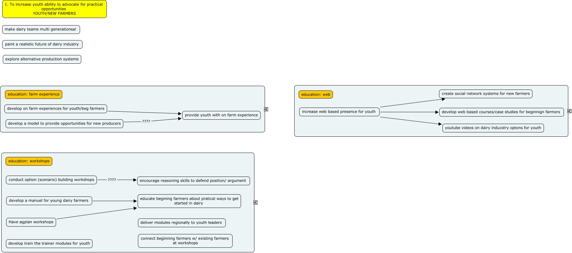 This Concept Map, created with IHMC CmapTools, has information related to: Dairy-YOUTH, develop on farm experiences for youth/beg farmers provide youth with on farm experience, develop a model to provide opportunities for new producers ???? provide youth with on farm experience, increase web based presence for youth develop web based courses/case studies for beginnign farmers, increase web based presence for youth youtube videos on dairy inducstry optons for youth, Have agplan workshops educate begining farmers about pratical ways to get started in dairy, conduct option (scenario) buliding workshops ???? encourage reasoning skills to defend position/ argument, develop a manuel for young dairy farmers educate begining farmers about pratical ways to get started in dairy, increase web based presence for youth create social network systems for new farmers