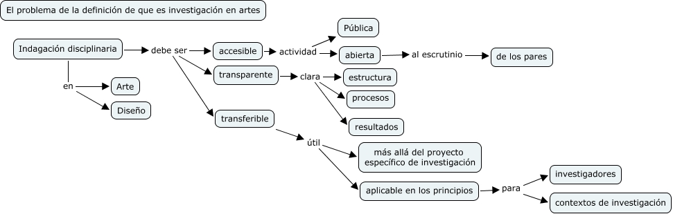 Este Cmap, tiene información relacionada con: El problema de la definición de lo que es investigación en artes, Indagación disciplinaria en Diseño, abierta al escrutinio de los pares, Indagación disciplinaria debe ser accesible, Indagación disciplinaria debe ser transparente, aplicable en los principios para contextos de investigación, Indagación disciplinaria en Arte, transparente clara resultados, transferible útil más allá del proyecto específico de investigación, accesible actividad Pública, accesible actividad abierta, aplicable en los principios para investigadores, transparente clara procesos, transparente clara estructura, Indagación disciplinaria debe ser transferible, transferible útil aplicable en los principios