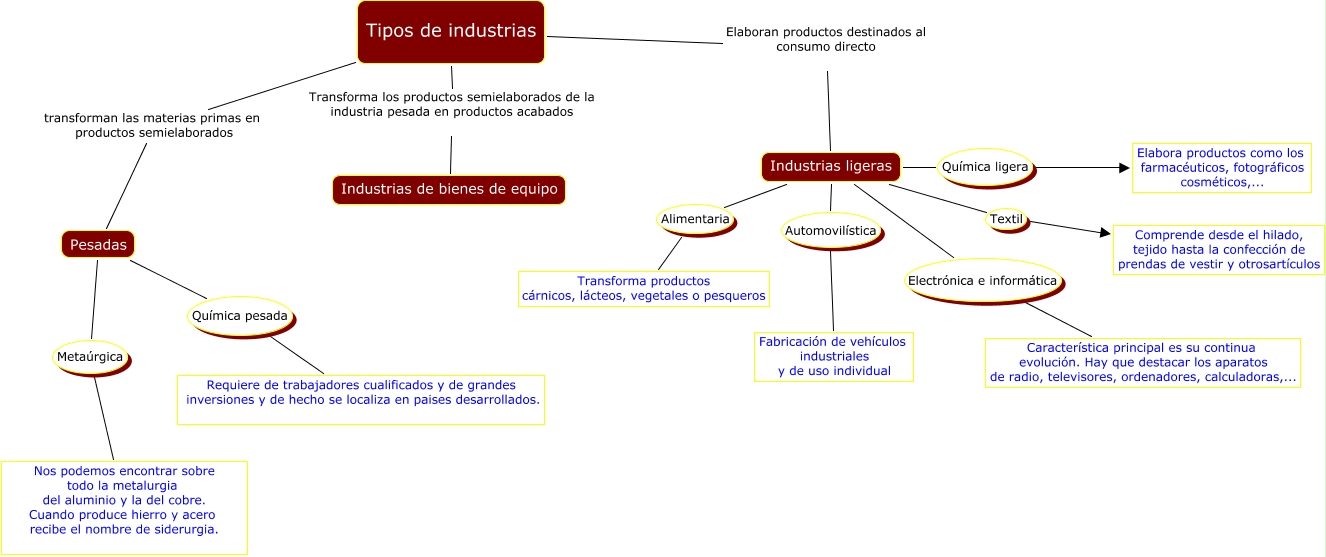 Este Cmap, tiene información relacionada con: Tipos de industrias, Tipos de industrias transforman las materias primas en productos semielaborados Pesadas, Industrias ligeras Química ligera Elabora productos como los farmacéuticos, fotográficos cosméticos,..., Industrias ligeras Automovilística Fabricación de vehículos industriales y de uso individual, Industrias ligeras Textil Comprende desde el hilado, tejido hasta la confección de prendas de vestir y otrosartículos, Tipos de industrias Transforma los productos semielaborados de la industria pesada en productos acabados Industrias de bienes de equipo, Pesadas Química pesada Requiere de trabajadores cualificados y de grandes inversiones y de hecho se localiza en paises desarrollados., Pesadas Metaúrgica Nos podemos encontrar sobre todo la metalurgia del aluminio y la del cobre. Cuando produce hierro y acero recibe el nombre de siderurgia., Industrias ligeras Alimentaria Transforma productos cárnicos, lácteos, vegetales o pesqueros, Industrias ligeras Electrónica e informática Característica principal es su continua evolución. Hay que destacar los aparatos de radio, televisores, ordenadores, calculadoras,..., Tipos de industrias Elaboran productos destinados al consumo directo Industrias ligeras