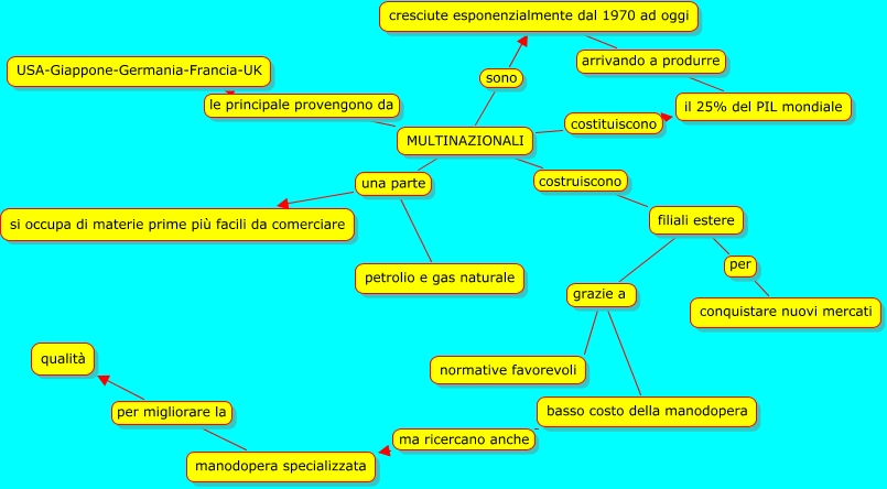 Questa Cmap, creata con IHMC CmapTools, contiene informazioni relative a: Multinazionali, manodopera specializzata per migliorare la qualità, MULTINAZIONALI costruiscono filiali estere, MULTINAZIONALI una parte si occupa di materie prime più facili da comerciare, basso costo della manodopera ma ricercano anche manodopera specializzata, MULTINAZIONALI sono cresciute esponenzialmente dal 1970 ad oggi, MULTINAZIONALI le principale provengono da USA-Giappone-Germania-Francia-UK, filiali estere grazie a normative favorevoli, MULTINAZIONALI una parte petrolio e gas naturale, cresciute esponenzialmente dal 1970 ad oggi arrivando a produrre il 25% del PIL mondiale, MULTINAZIONALI costituiscono il 25% del PIL mondiale, filiali estere grazie a basso costo della manodopera, filiali estere per conquistare nuovi mercati