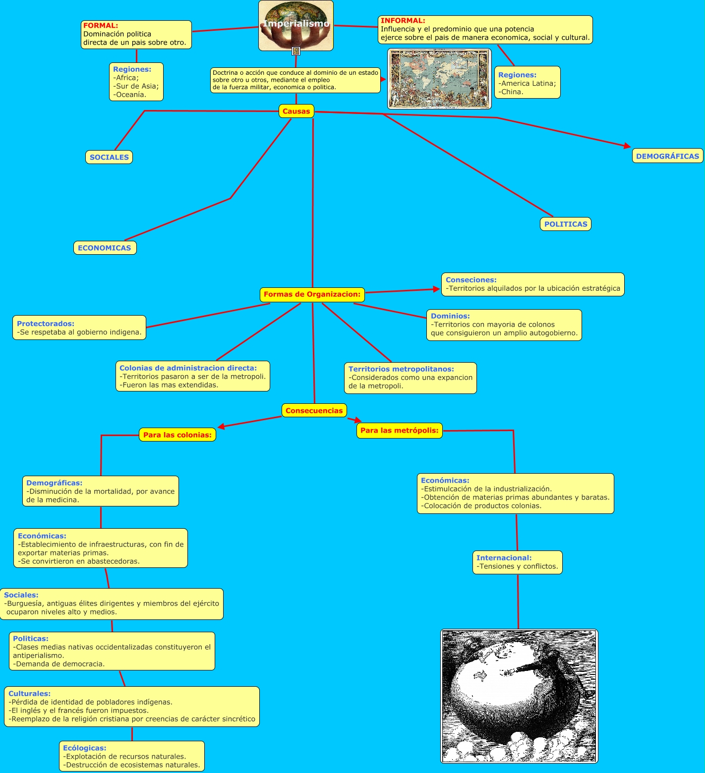 Este Cmap, tiene información relacionada con: historia imperialismo cata y marle.cmap1, Formas de Organizacion: Conseciones: -Territorios alquilados por la ubicación estratégica, Económicas: -Establecimiento de infraestructuras, con fin de exportar materias primas. -Se convirtieron en abastecedoras. Sociales: -Burguesía, antiguas élites dirigentes y miembros del ejército ocuparon niveles alto y medios., Causas ECONOMICAS, Causas Formas de Organizacion:, Económicas: -Estimulcación de la industrialización. -Obtención de materias primas abundantes y baratas. -Colocación de productos colonias. Internacional: -Tensiones y conflictos., Politicas: -Clases medias nativas occidentalizadas constituyeron el antiperialismo. -Demanda de democracia. Culturales: -Pérdida de identidad de pobladores indígenas. -El inglés y el francés fueron impuestos. -Reemplazo de la religión cristiana por creencias de carácter sincrético, Consecuencias Para las metrópolis:, Demográficas: -Disminución de la mortalidad, por avance de la medicina. Económicas: -Establecimiento de infraestructuras, con fin de exportar materias primas. -Se convirtieron en abastecedoras., Formas de Organizacion: Territorios metropolitanos: -Considerados como una expancion de la metropoli., Culturales: -Pérdida de identidad de pobladores indígenas. -El inglés y el francés fueron impuestos. -Reemplazo de la religión cristiana por creencias de carácter sincrético Ecólogicas: -Explotación de recursos naturales. -Destrucción de ecosistemas naturales., Para las metrópolis: Económicas: -Estimulcación de la industrialización. -Obtención de materias primas abundantes y baratas. -Colocación de productos colonias., Formas de Organizacion: Dominios: -Territorios con mayoria de colonos que consiguieron un amplio autogobierno., Imperialismo FORMAL: Dominación politica directa de un pais sobre otro. Regiones: -Africa; -Sur de Asia; -Oceanía., Causas SOCIALES, Formas de Organizacion: Colonias de administracion directa: -Territorios pasaron a ser de la metropoli. -Fueron las mas extendidas., Sociales: -Burguesía, antiguas élites dirigentes y miembros del ejército ocuparon niveles alto y medios. Politicas: -Clases medias nativas occidentalizadas constituyeron el antiperialismo. -Demanda de democracia., Consecuencias Para las colonias:, Imperialismo Doctrina o acción que conduce al dominio de un estado sobre otro u otros, mediante el empleo de la fuerza militar, economica o politica. Causas, Internacional: -Tensiones y conflictos., Causas DEMOGRÁFICAS