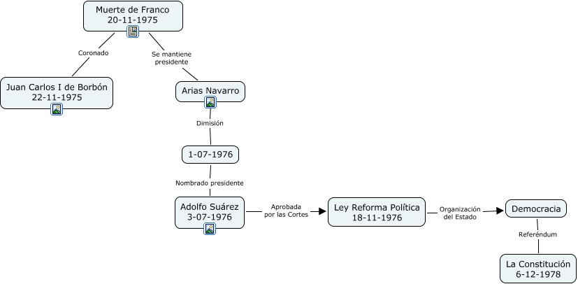 Este Cmap, tiene información relacionada con: grupo1cmap, Arias Navarro Dimisión 1-07-1976, Muerte de Franco 20-11-1975 Se mantiene presidente Arias Navarro, Muerte de Franco 20-11-1975 Coronado Juan Carlos I de Borbón 22-11-1975, Adolfo Suárez 3-07-1976 Aprobada por las Cortes Ley Reforma Política 18-11-1976, 1-07-1976 Nombrado presidente Adolfo Suárez 3-07-1976, Democracia Referéndum La Constitución 6-12-1978, Ley Reforma Política 18-11-1976 Organización del Estado Democracia
